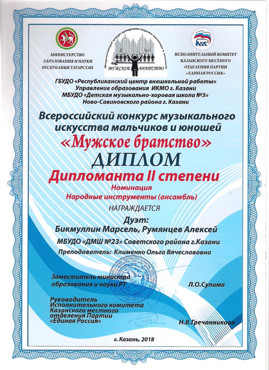Всероссийский конкурс музыкального искусства мальчиков и юношей "Мужское братство" - Диплом дипломанта 2 степени - Дуэт: Бикмуллин Марсель, Румянцев Алексей (преподаватель: Клименко О.В.)