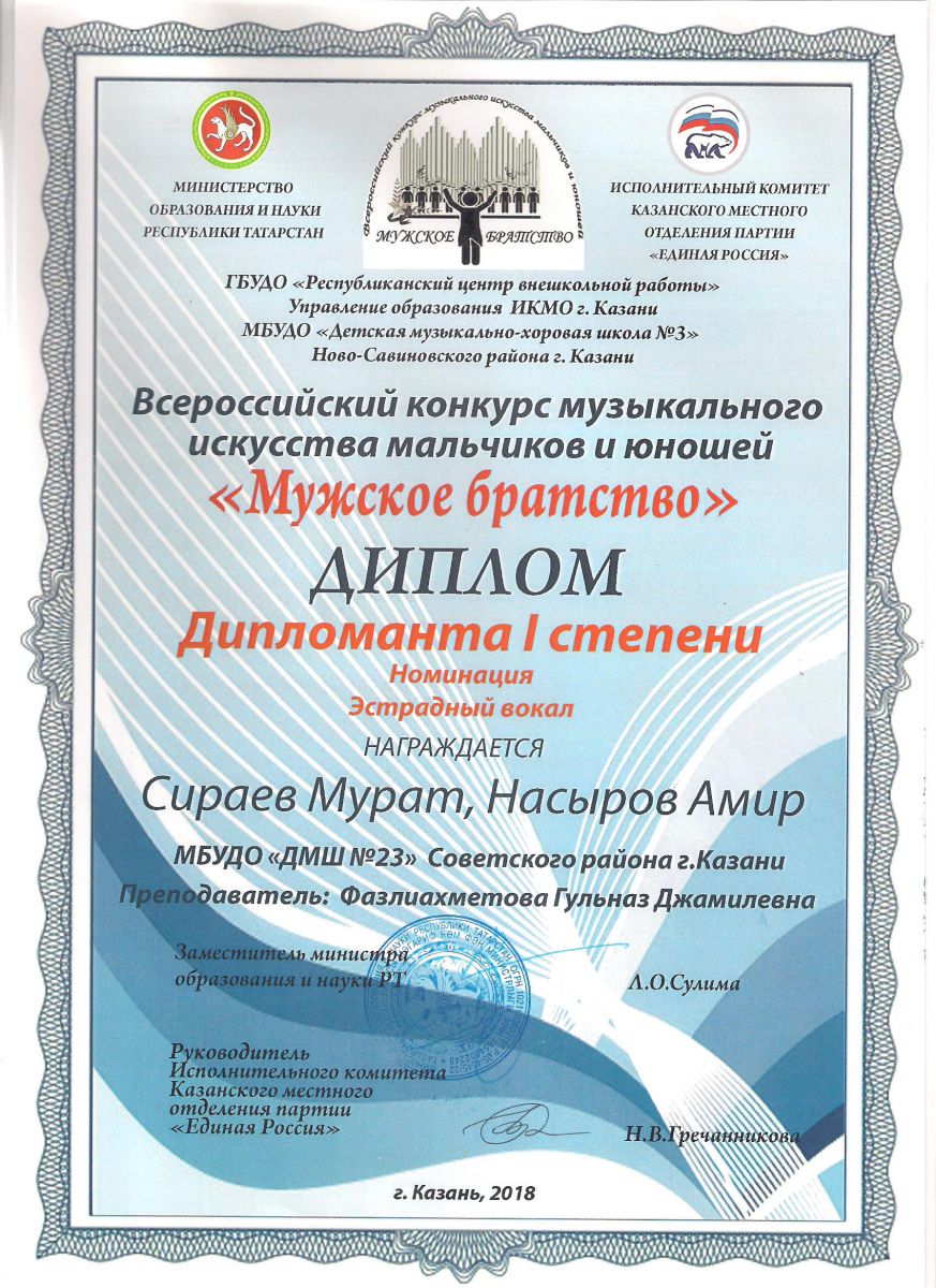 Всероссийский конкурс музыкального искусства мальчиков и юношей "Мужское братство" - Диплом дипломанта 1 степени - Сираев Мурат, Насыров Амир (преподаватель: Фазлиахметова Г.Д.)