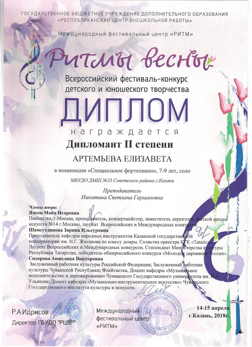 Всероссийский фестиваль-конкурс детского и юношеского творчества "Ритмы весны" - Диплом дипломанта 2 степени - Артемьева Елизавета (преподаватель: Никитина С.Г.)