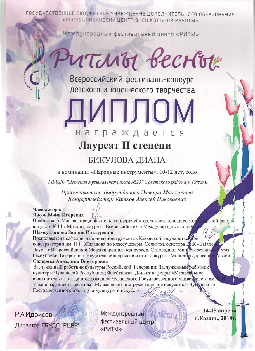 Всероссийский фестиваль-конкурс детского и юношеского творчества "Ритмы весны" - Диплом лауреата 2 степени - Бикулова Диана (преподаватель: Бадрутдинова Э.М., концертмейстер: Катков А.Н.)