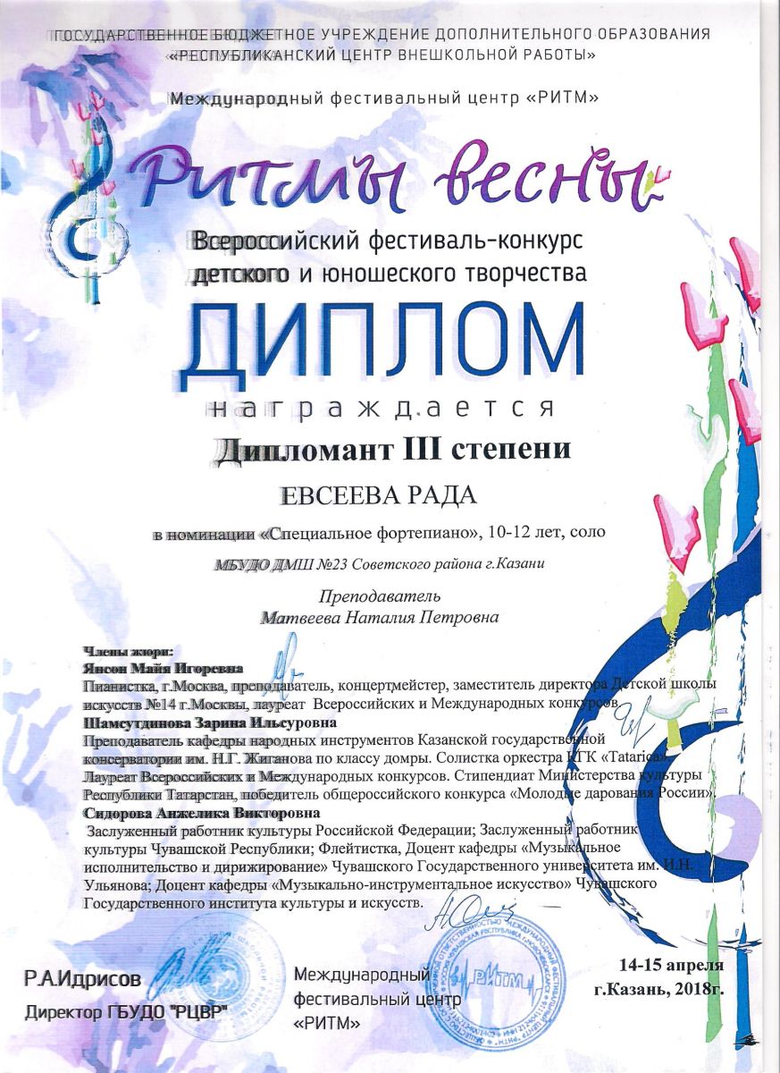 Всероссийский фестиваль-конкурс детского и юношеского творчества "Ритмы весны" - Диплом дипломанта 3 степени - Евсеева Рада (преподаватель: Матвеева Н.П.)