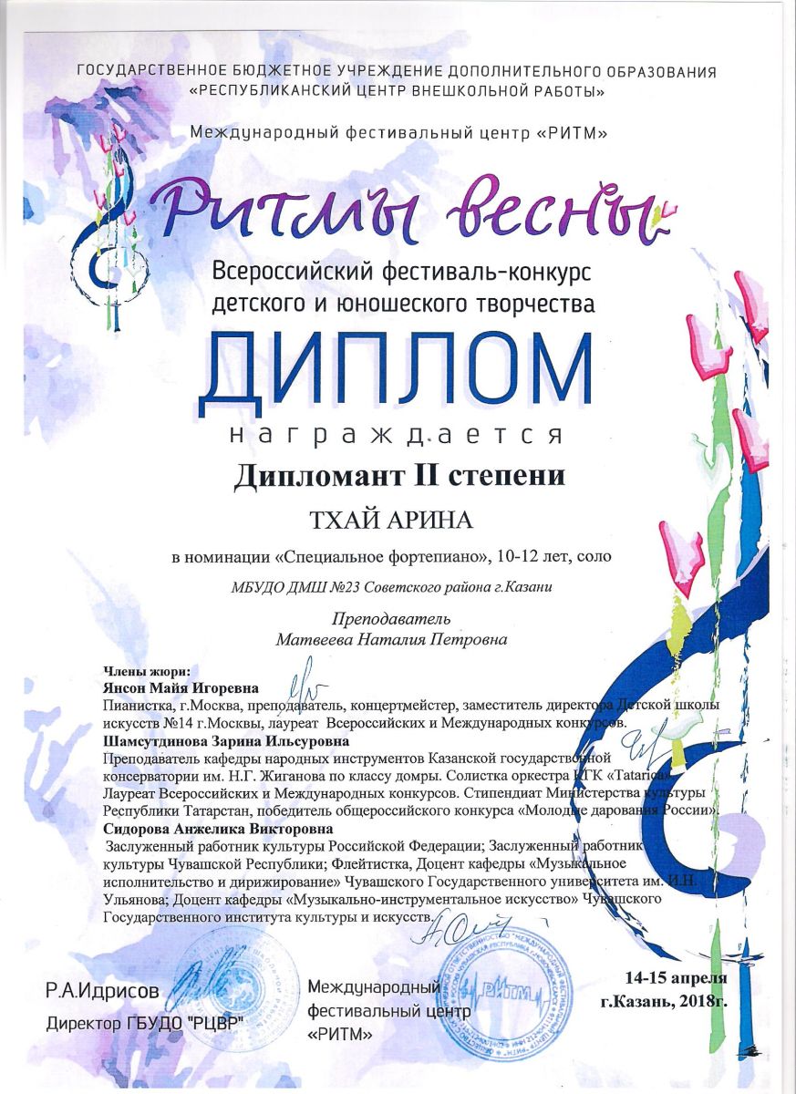 Всероссийский фестиваль-конкурс детского и юношеского творчества "Ритмы весны" - Диплом дипломанта 2 степени - Тхай Арина (преподаватель: Матвеева Н.П.)