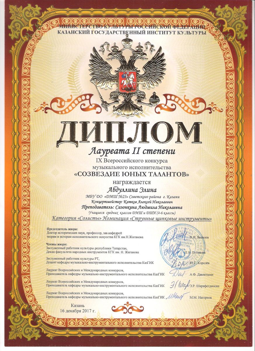 IX Всероссийский конкурс музыкального исполнительства "Созвездие юных талантов" - Диплом лауреата 2 степени - Абдуллина Элина (преподаватель: Сазонкина Л.Н., концертмейстер: Катков А.Н.)