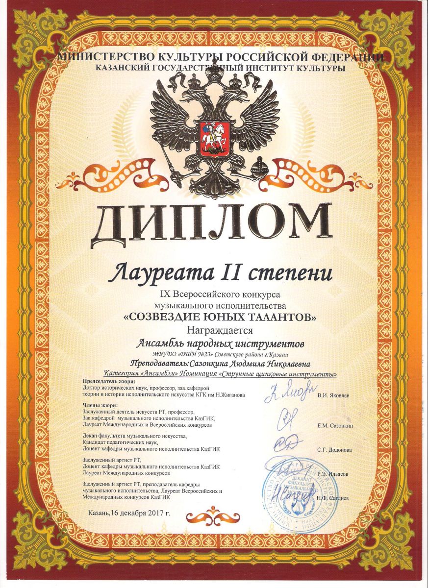 IX Всероссийский конкурс музыкального исполнительства "Созвездие юных талантов" - Диплом лауреата 2 степени - Ансамбль народных инструментов (преподаватель: Сазонкина Л.Н.)