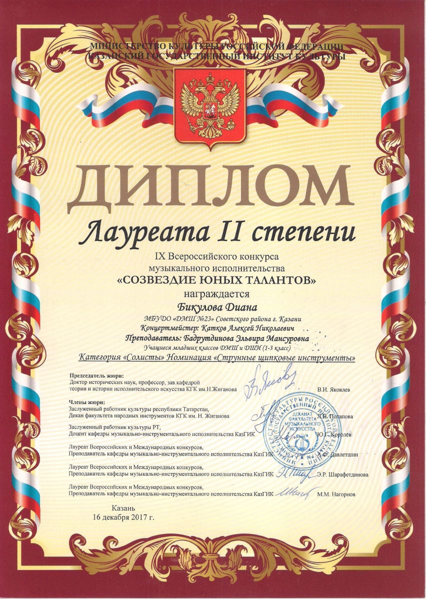 IX Всероссийский конкурс музыкального исполнительства "Созвездие юных талантов" - Диплом лауреата 2 степени - Бикулова Диана (преподаватель: Бадрутдинова Э.М., концертмейстер: Катков А.Н.)
