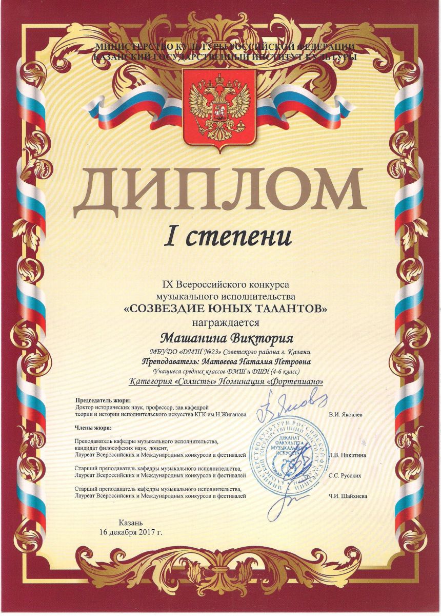 IX Всероссийский конкурс музыкального исполнительства "Созвездие юных талантов" - Диплом 1 степени - Машанина Виктория (преподаватель: Матвеева Н.П.)