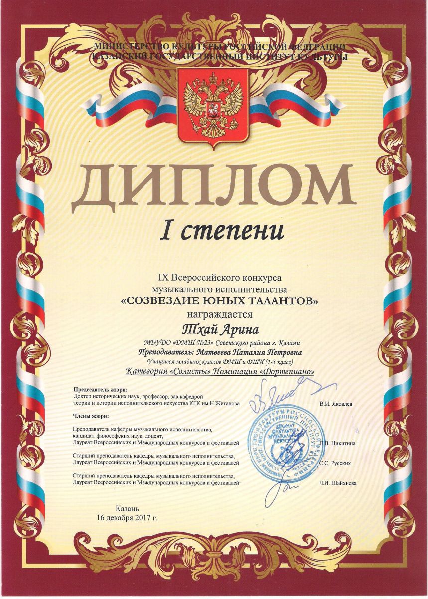 IX Всероссийский конкурс музыкального исполнительства "Созвездие юных талантов" - Диплом 1 степени - Тхай Арина (преподаватель: Матвеева Н.П.)