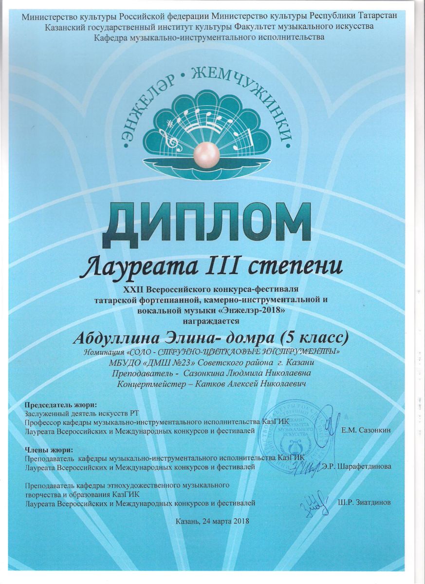 XXII Всероссийский конкурс-фестиваль татарской фортепианной, камерно-инструментальной и вокальной музыки "Энжелэр-2018" - Диплом лауреата 3 степени - Абдуллина Элина (преподаватель: Сазонкина Л.Н., концертмейстер: Катков А.Н.)