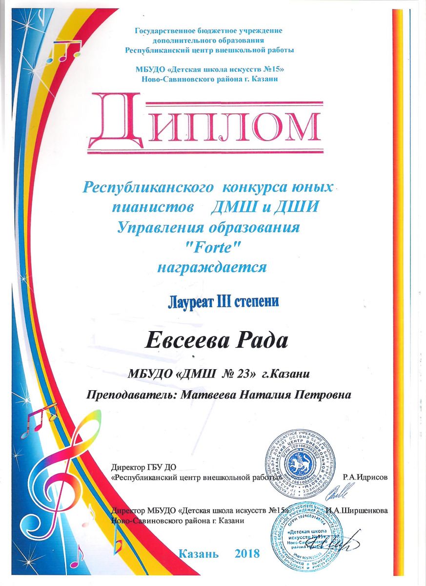 Республиканский конкурс юных пианистов "Forte" - Диплом лауреата 3 степени - Евсеева Рада (преподаватель: Матвеева Н.П.)