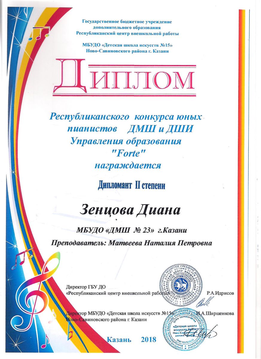 Республиканский конкурс юных пианистов "Forte" - Диплом дипломанта 2 степени - Зенцова Диана (преподаватель: Матвеева Н.П.)