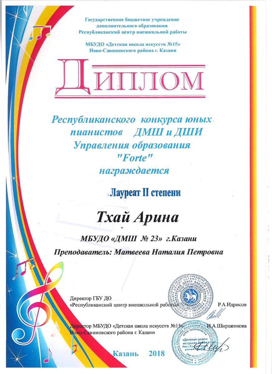 Республиканский конкурс юных пианистов "Forte" - Диплом лауреата 2 степени - Тхай Арина (преподаватель: Матвеева Н.П.)