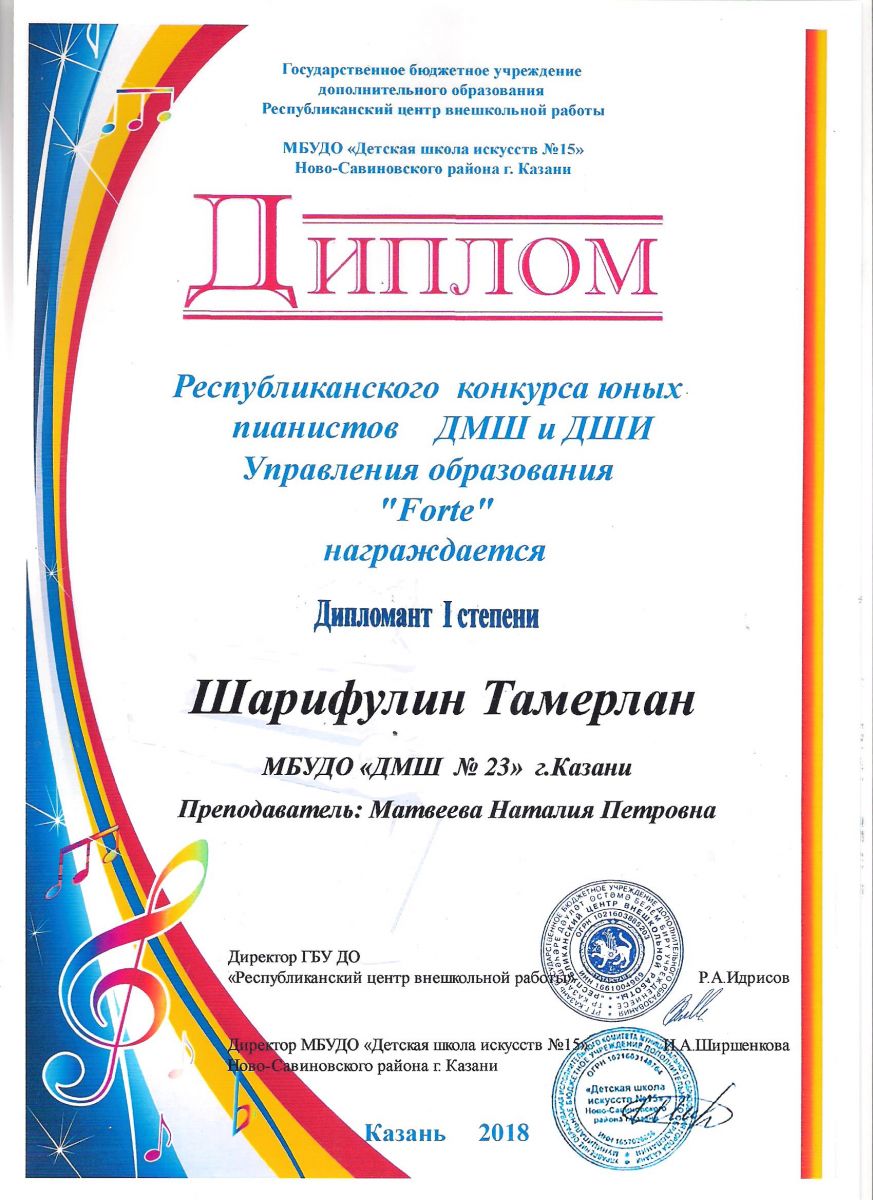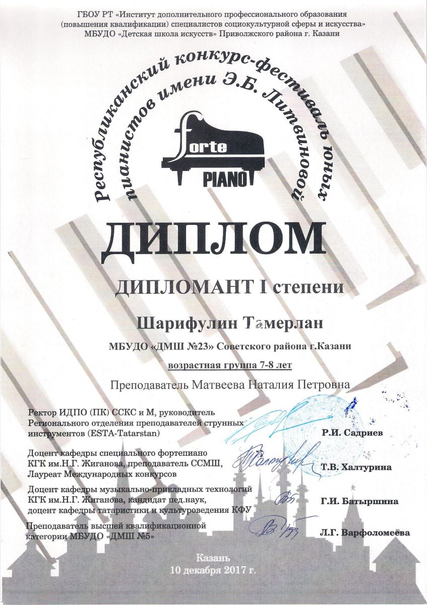 Республиканский конкурс-фестиваль юных пианистов имени Э.Б.Литвиновой "Forte-PIANO" - Диплом дипломанта 1 степени - Шарифулин Т. (преподаватель: Матвеева Н.П.)