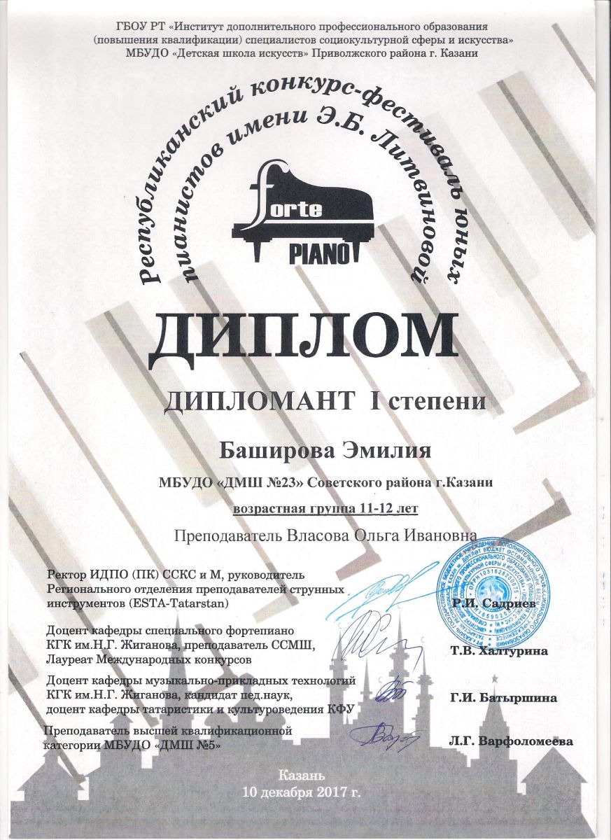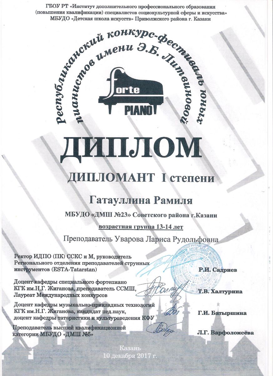 Республиканский конкурс-фестиваль юных пианистов имени Э.Б.Литвиновой "Forte-PIANO" - Диплом дипломанта 1 степени - Гатауллина Рамиля (преподаватель: Уварова Л.Р.)