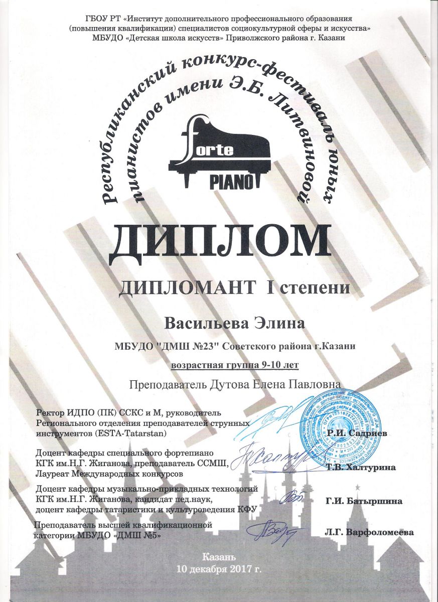 Республиканский конкурс-фестиваль юных пианистов имени Э.Б.Литвиновой "Forte-PIANO" - Диплом дипломанта 1 степени - Васильева Элина (преподаватель: Дутова Е.П.)