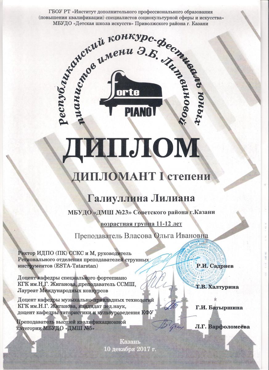 Республиканский конкурс-фестиваль юных пианистов имени Э.Б.Литвиновой "Forte-PIANO" - Диплом дипломанта 1 степени - Галиуллина Л. (преподаватель: Власова О.И.)