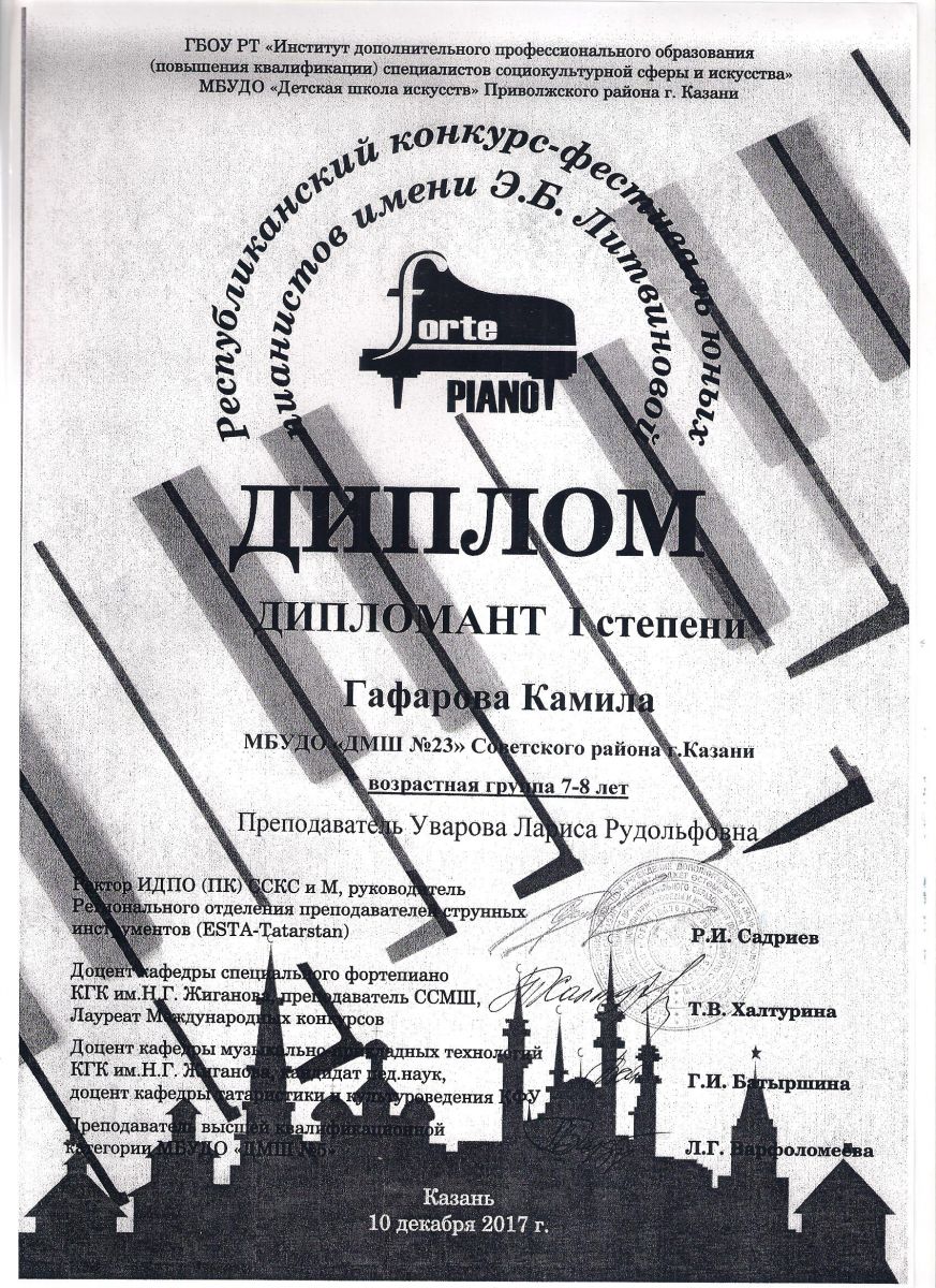 Республиканский конкурс-фестиваль юных пианистов имени Э.Б.Литвиновой "Forte-PIANO" - Диплом дипломанта 1 степени - Гафарова Камила (преподаватель: Уварова Л.Р.)
