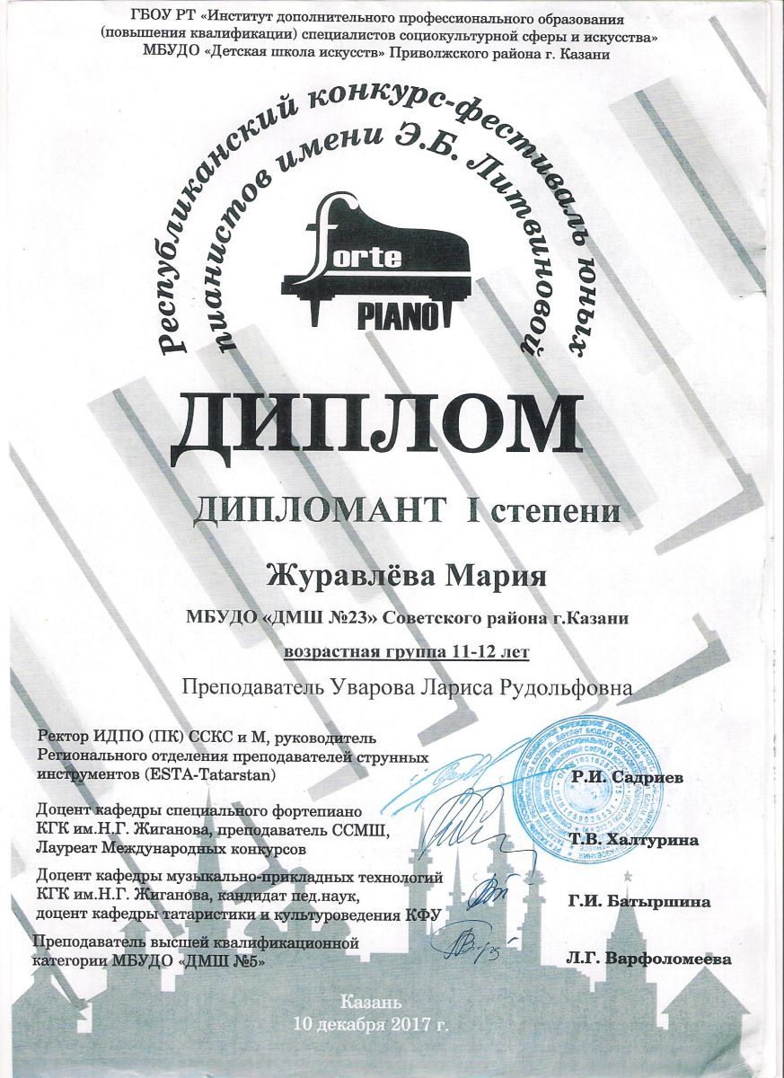 Республиканский конкурс-фестиваль юных пианистов имени Э.Б.Литвиновой "Forte-PIANO" - Диплом дипломанта 1 степени - Журавлёва Мария (преподаватель: Уварова Л.Р.)