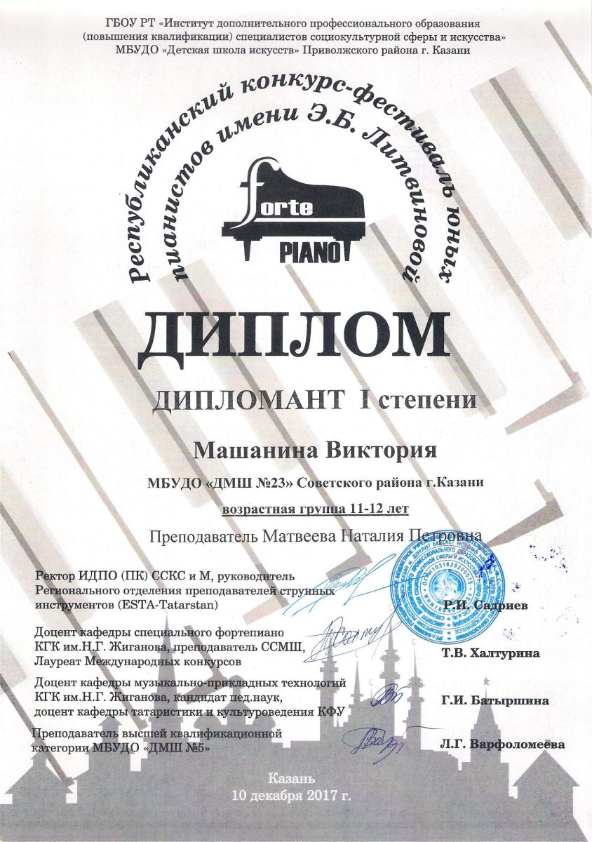 Республиканский конкурс-фестиваль юных пианистов имени Э.Б.Литвиновой "Forte-PIANO" - Диплом дипломанта 1 степени - Машанина В. (преподаватель: Матвеева Н.П.)