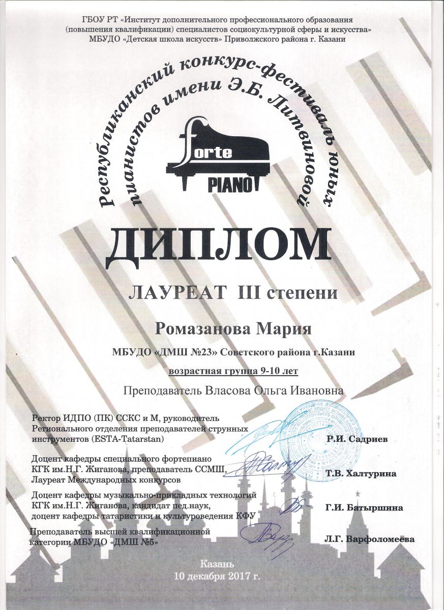 Республиканский конкурс-фестиваль юных пианистов имени Э.Б.Литвиновой "Forte-PIANO" - Диплом лауреата 3 степени - Ромазанова М. (преподаватель: Власова О.И.)