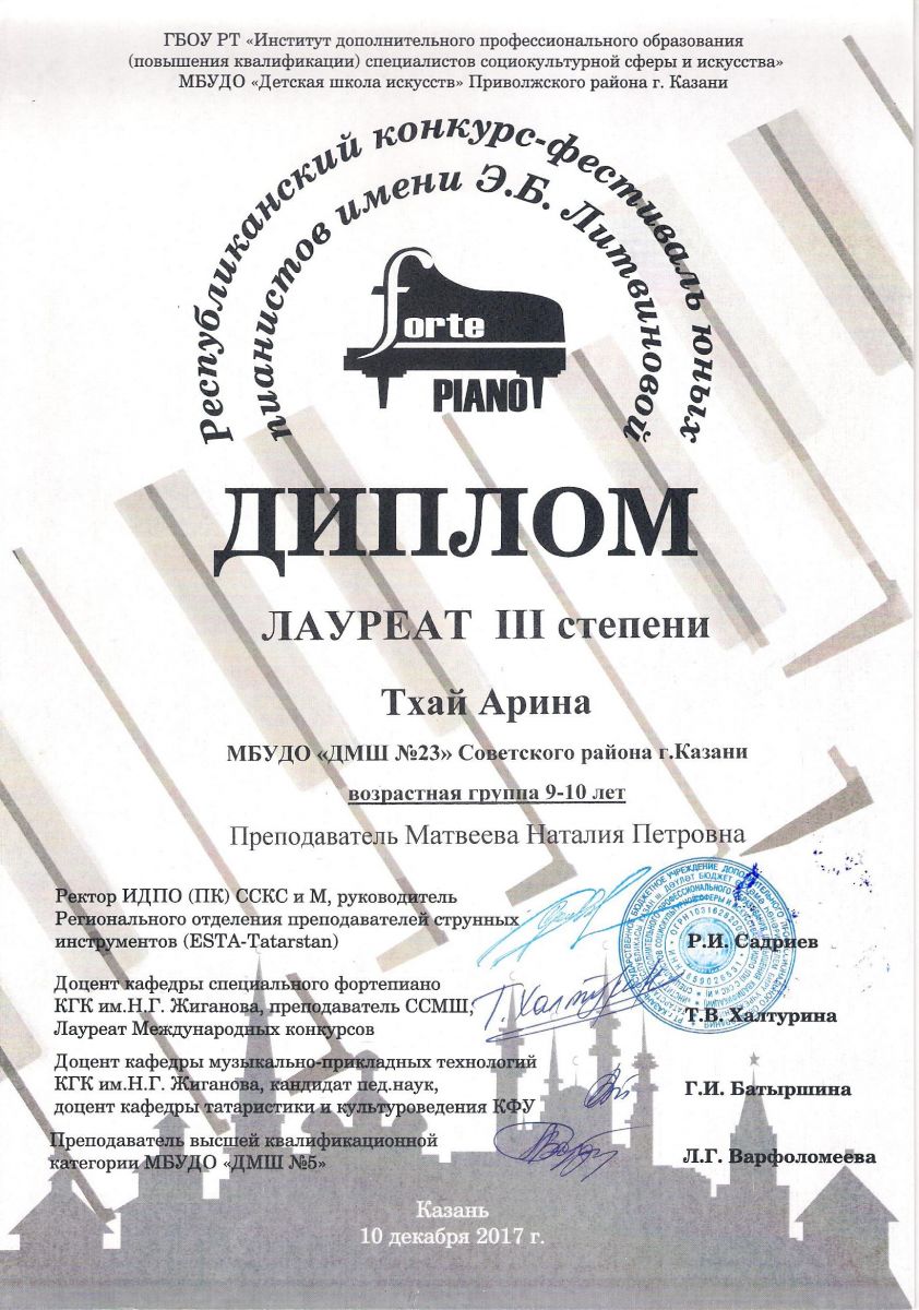 Республиканский конкурс-фестиваль юных пианистов имени Э.Б.Литвиновой "Forte-PIANO" - Диплом лауреата 3 степени - Тхай А. (преподаватель: Матвеева Н.П.)