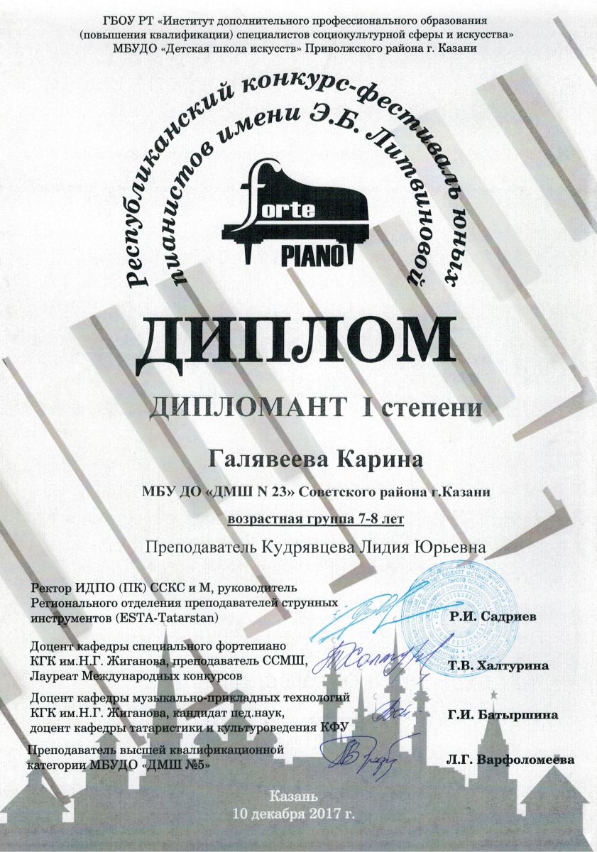 Республиканский конкурс-фестиваль юных пианистов имени Э.Б.Литвиновой "Forte-PIANO" - Диплом дипломанта 1 степени - Галявеева Карина (преподаватель: Кудрявцева Л.Ю.)