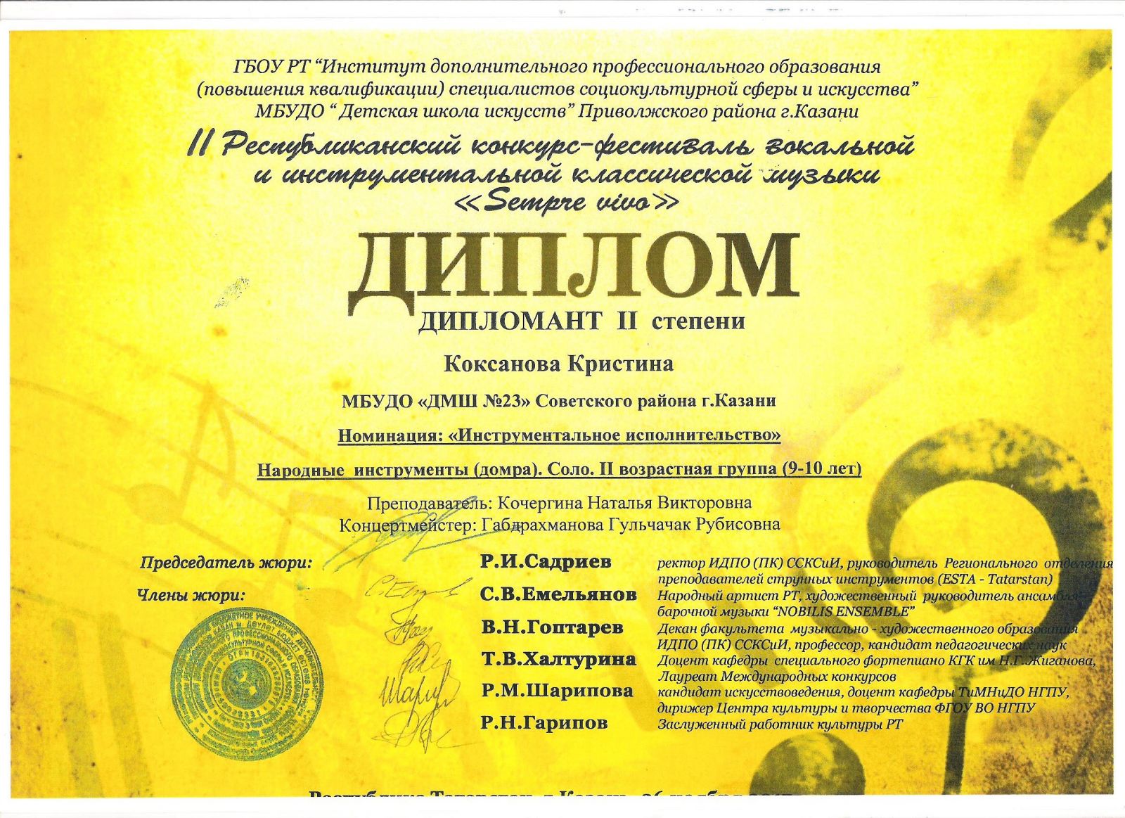 II Республиканский конкурс-фестиваль вокальной и инструментальной классической музыки "Sempre vivo" - Диплом дипломанта 2 степени - Коксанова К. (преподаватель: Кочергина Н.В., концертмейстер: Габдрахманова Г.Р.)