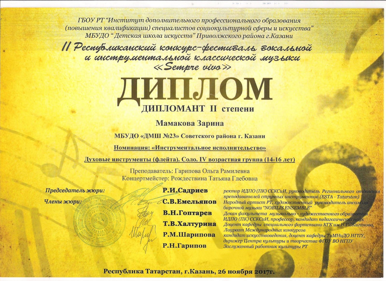 II Республиканский конкурс-фестиваль вокальной и инструментальной классической музыки "Sempre vivo" - Диплом дипломанта 2 степени - Мамакова З.(преподаватель: Гарипова О.Р., концертмейстер: Рождествина Т.Г.)