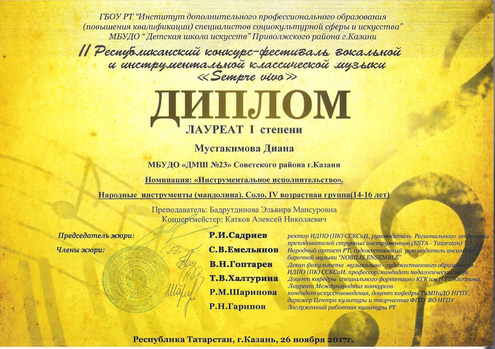 II Республиканский конкурс-фестиваль вокальной и инструментальной классической музыки "Sempre vivo" - Диплом лауреата 1 степени - Мустакимова Д. (преподаватель: Бадрутдинова Э.М., концертмейстер: Катков А.Н.)
