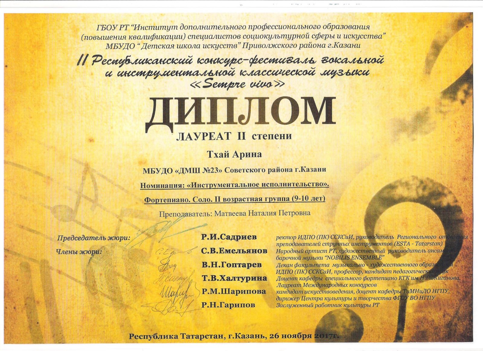 II Республиканский конкурс-фестиваль вокальной и инструментальной классической музыки "Sempre vivo" - Диплом лауреата 2 степени - Тхай А. (преподаватель: Матвеева Н.П.)