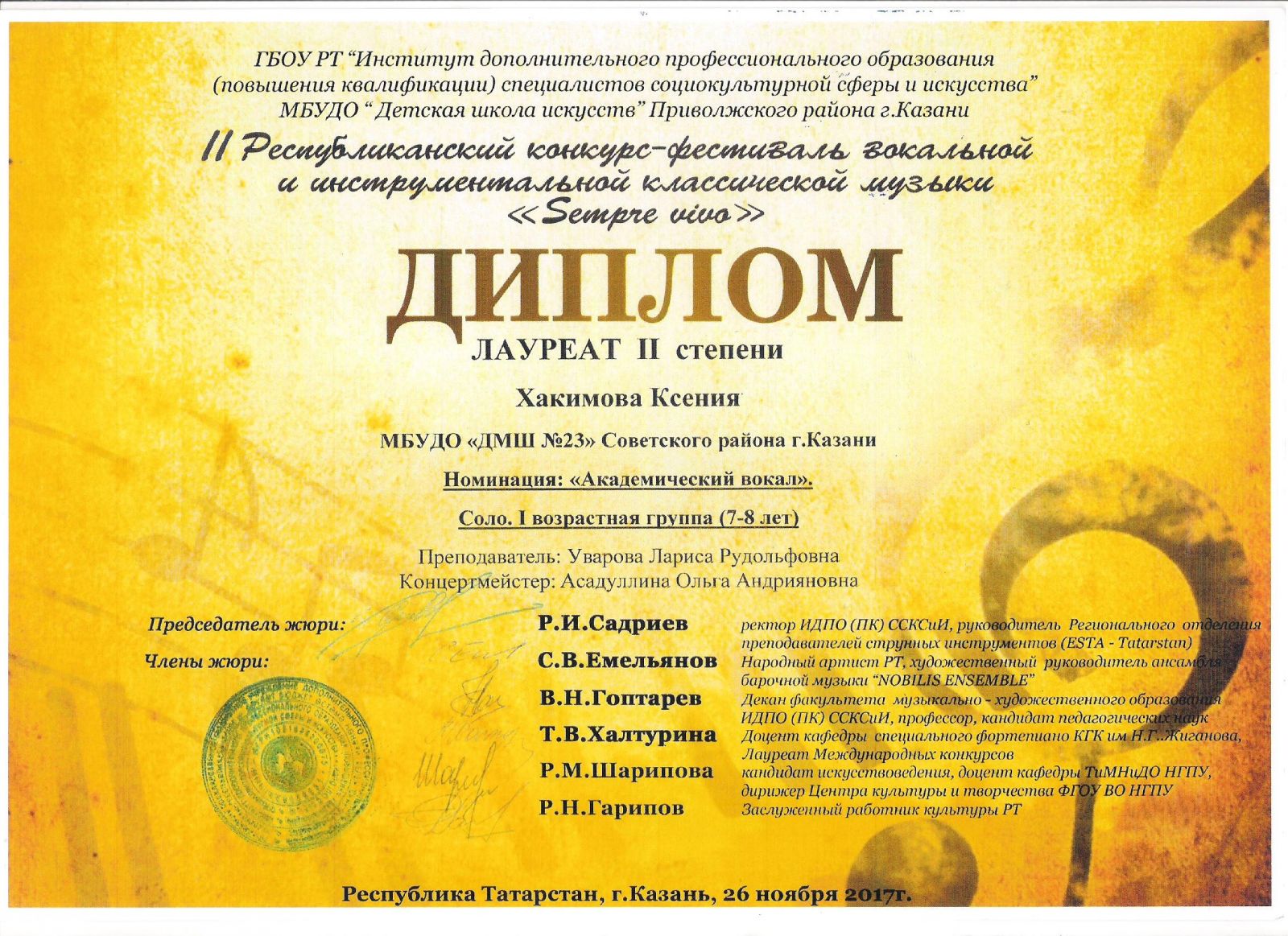 II Республиканский конкурс-фестиваль вокальной и инструментальной классической музыки "Sempre vivo" - Диплом лауреата 2 степени - Хакимова К. (преподаватель: Уварова Л.Р., концертмейстер: Асадуллина О.А.)