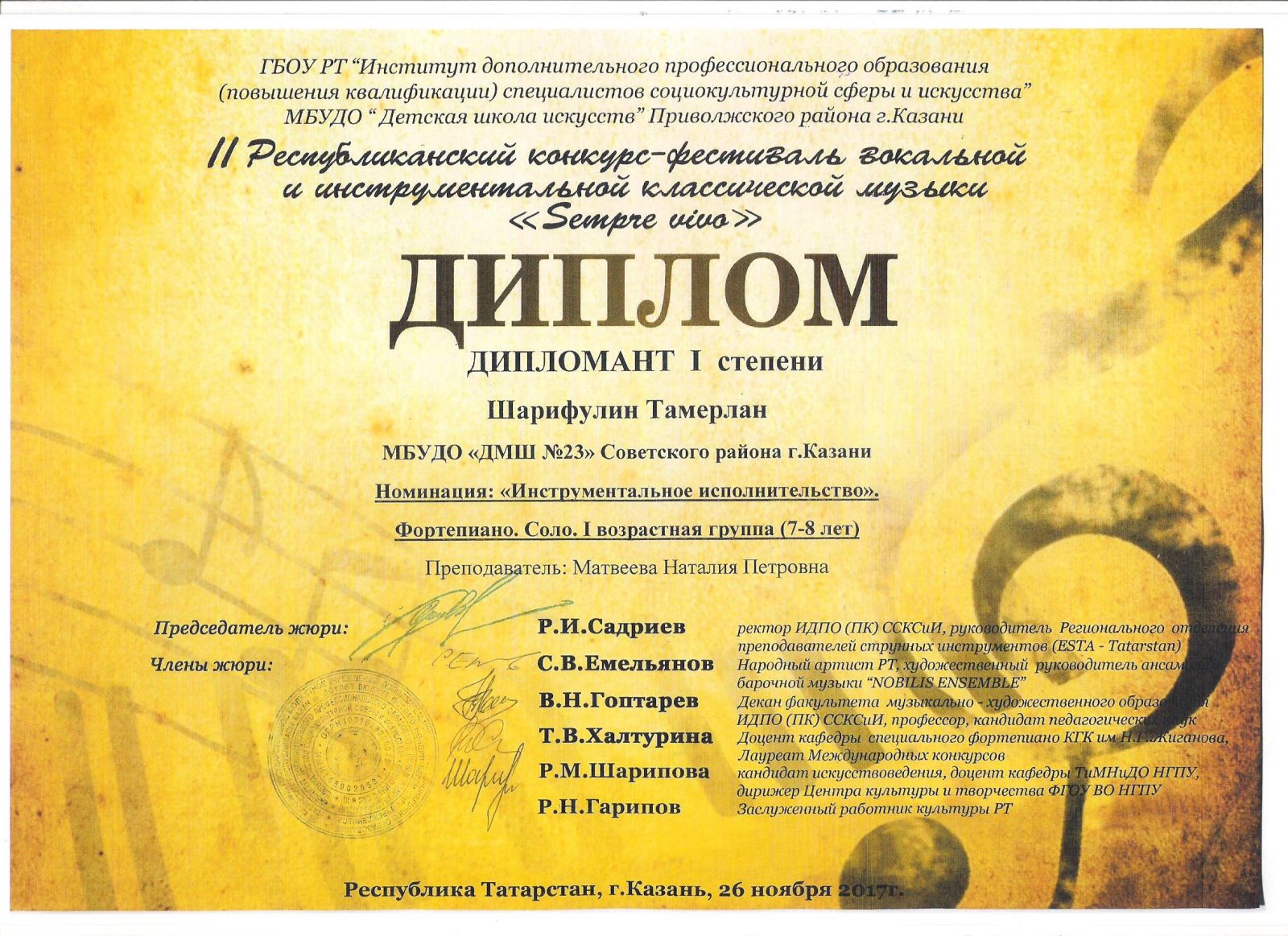II Республиканский конкурс-фестиваль вокальной и инструментальной классической музыки "Sempre vivo" - Диплом дипломанта 1 степени - Шарифулин Т. (преподаватель: Матвеева Н.П.)
