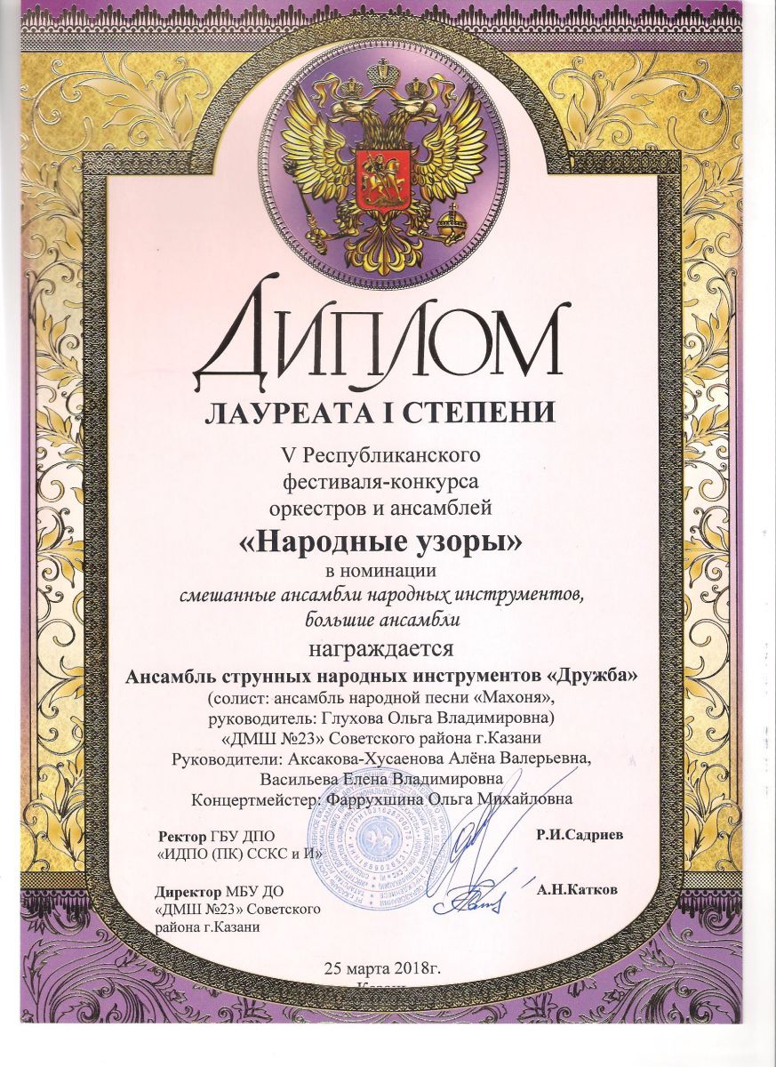 V Республиканский фестиваль-конкурс оркестров и ансамблей "Народные узоры" - Диплом лауреата 1 степени - Ансамбль струнных народных инструментов "Дружба" (руководители: Аксакова-Хусаенова А.В., Васильева Е.В., концертмейстер: Фаррухшина О.М.)