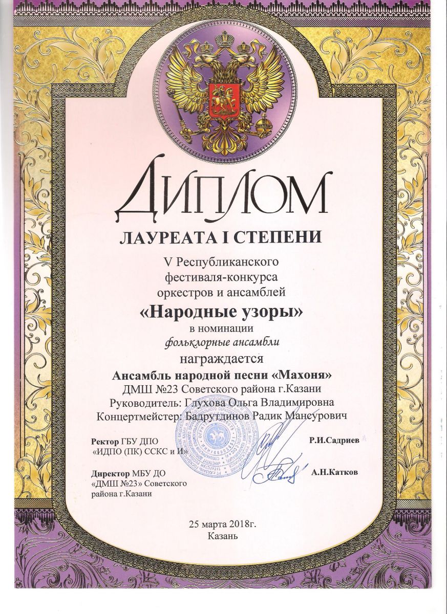 V Республиканский фестиваль-конкурс оркестров и ансамблей "Народные узоры" - Диплом лауреата 1 степени - Ансамбль народной песни "Махоня" (руководитель: Глухова О.В., концертмейстер: Бадрутдинов Р.М.)