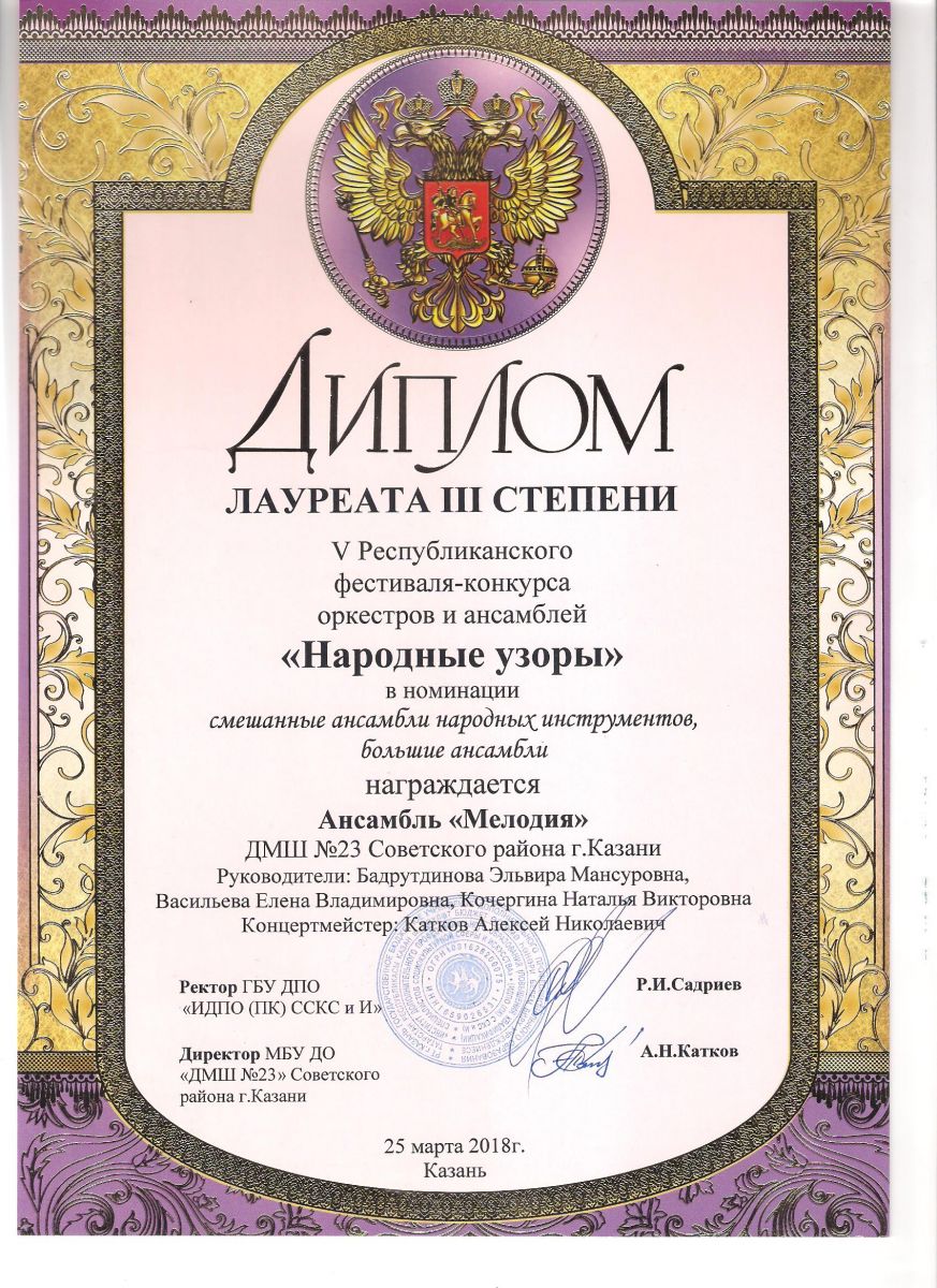 V Республиканский фестиваль-конкурс оркестров и ансамблей "Народные узоры" - Диплом лауреата 3 степени - Ансамбль "Мелодия" (руководители: Бадрутдинова Э.М., Васильева Е.В., Кочергина Н.В., концертмейстер: Катков А.Н.)
