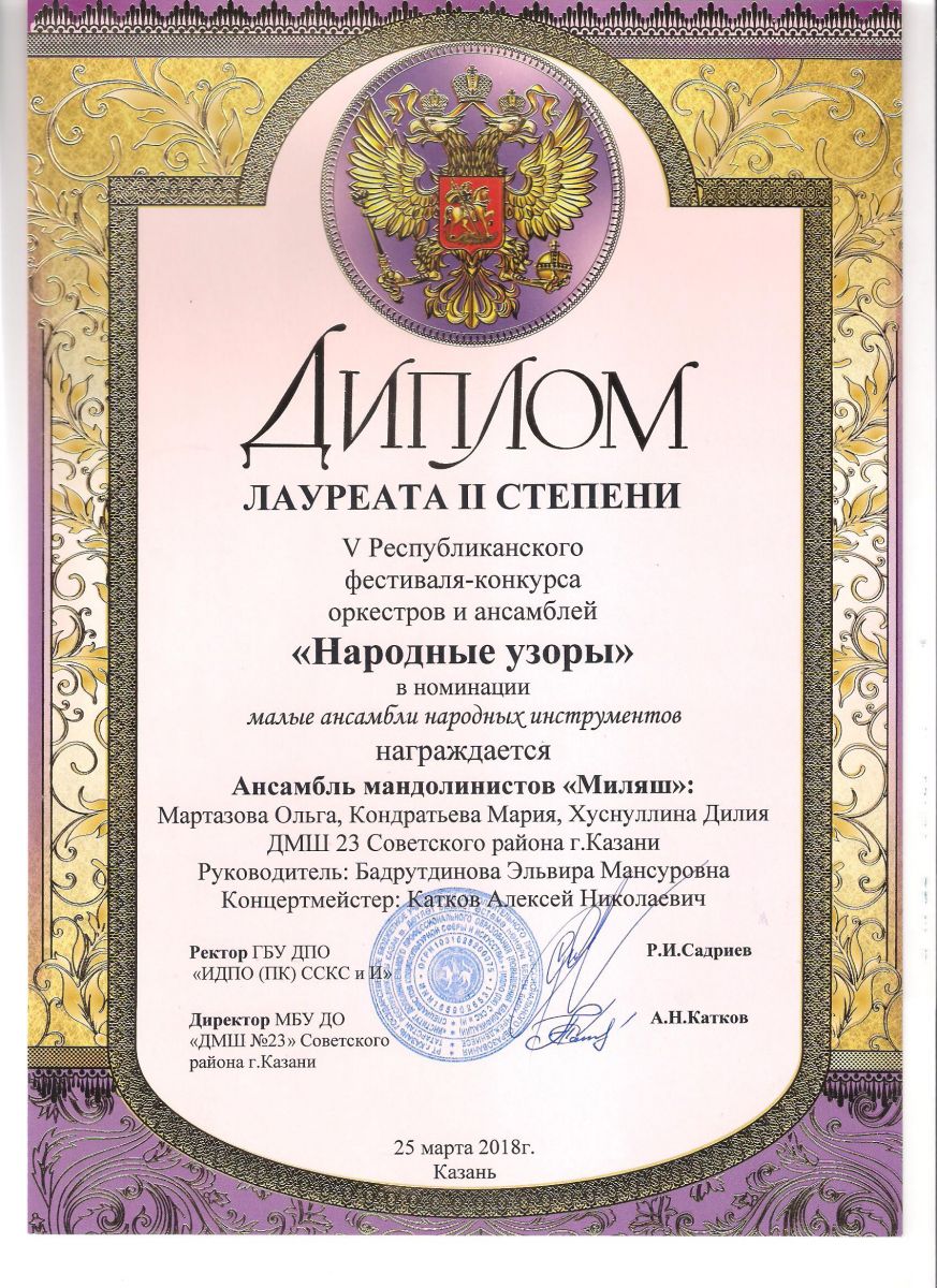 V Республиканский фестиваль-конкурс оркестров и ансамблей "Народные узоры" - Диплом лауреата 1 степени - Ансамбль мандолинистов "Миляш" (руководитель: Бадрутдинова Э.М., концертмейстер: Катков А.Н.)