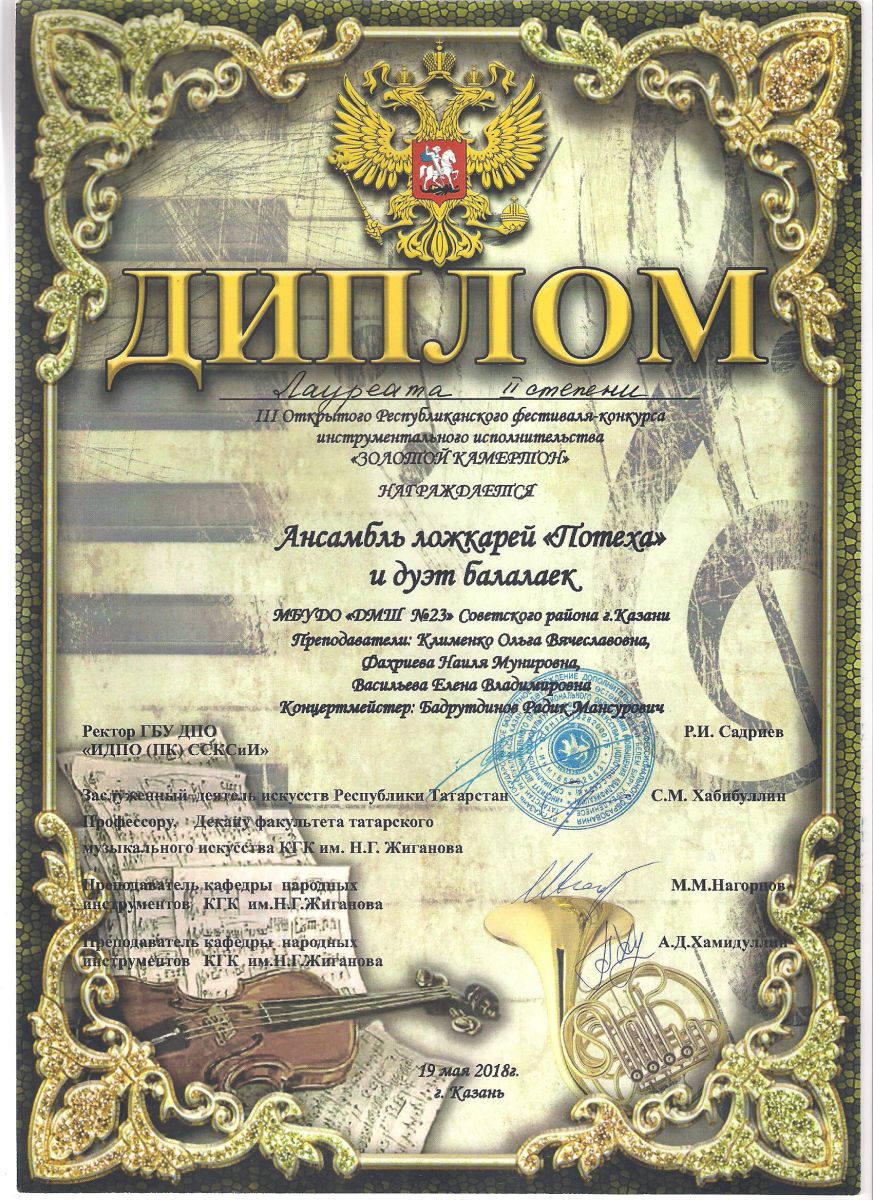 III Открытый Республиканский фестиваль-конкурс инструментального исполнительства "Золотой камертон" - Диплом лауреата 2 степени - Ансамбль ложкарей "Потеха" и дуэт балалаек (преподаватели: Клименко О.В., Фахриева Н.М., Васильева Е.В., концертмейстер: Бадрутдинов Р.М.)