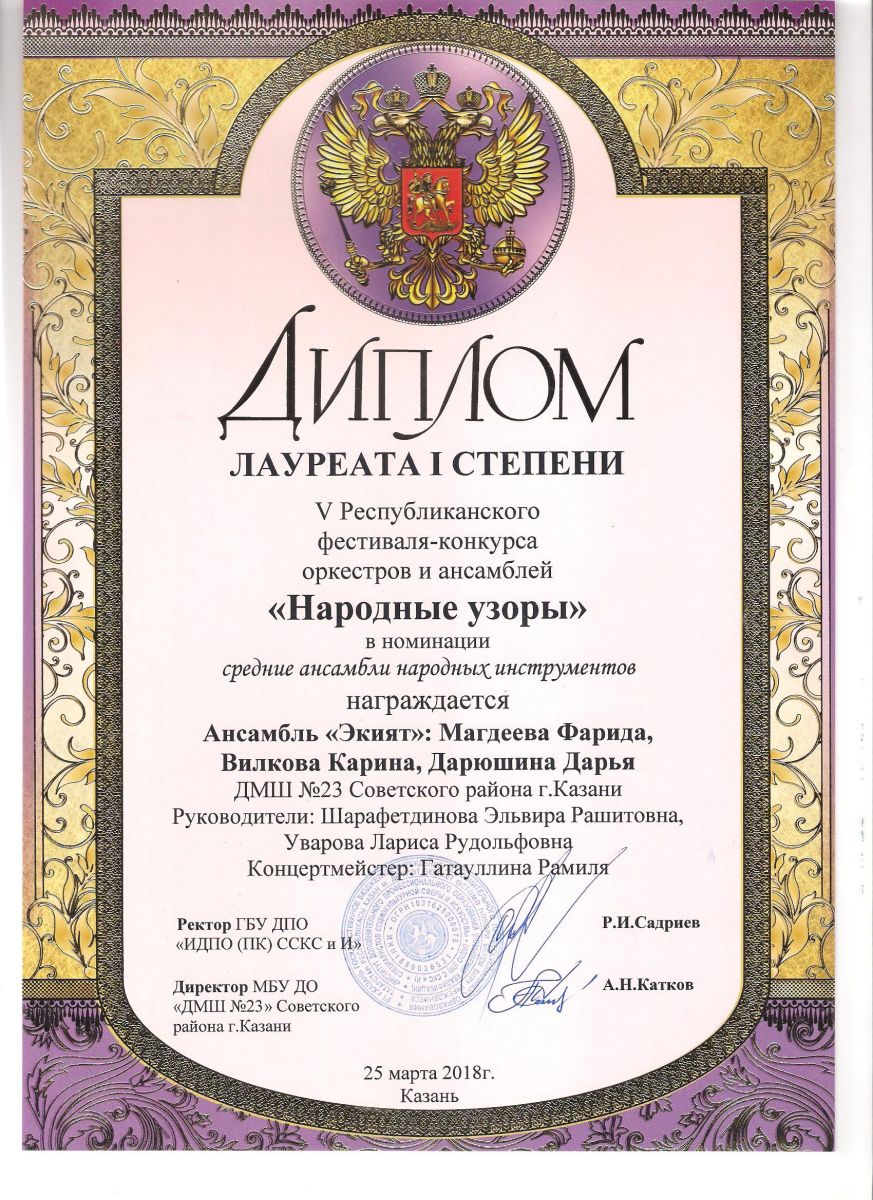 V Республиканский фестиваль-конкурс оркестров и ансамблей "Народные узоры" - Диплом лауреата 1 степени - Ансамбль "Экият" (руководители: Шарафетдинова Э.Р., Уварова Л.Р., концертмейстер: Гатауллина Рамиля)