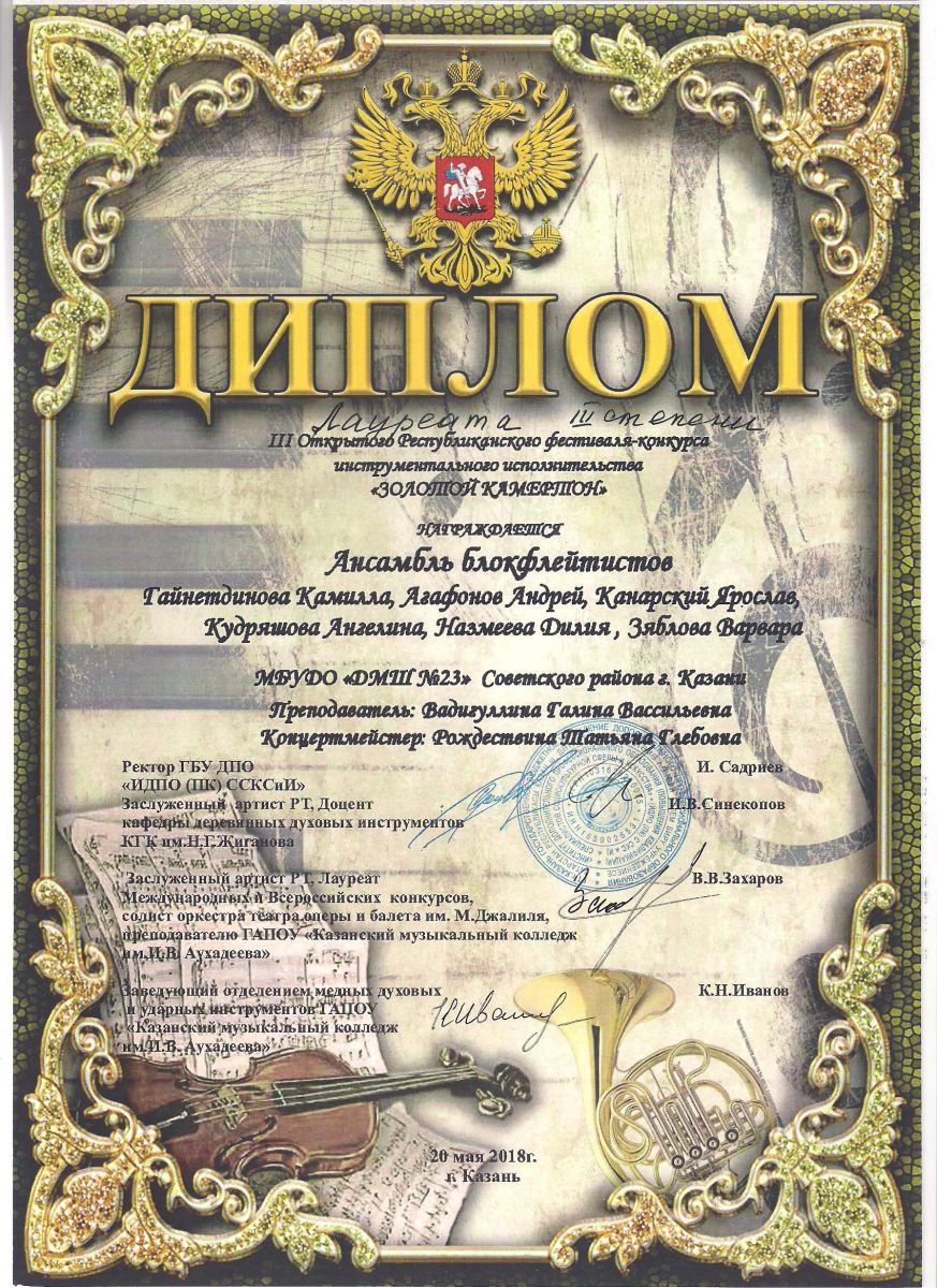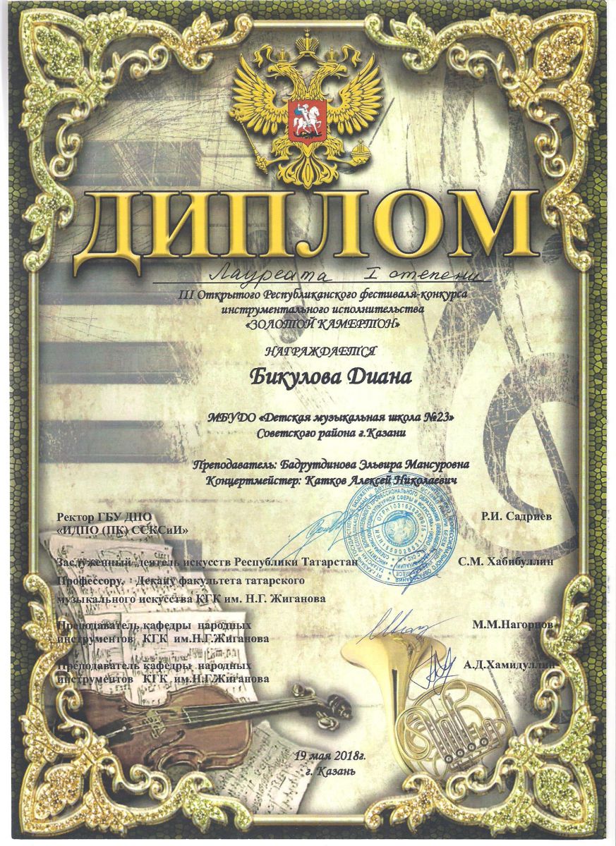 III Открытый Республиканский фестиваль-конкурс инструментального исполнительства "Золотой камертон" - Диплом лауреата 1 степени - Бикулова Диана (преподаватель: Бадрутдинова Э.М., концертмейстер: Катков А.Н.)