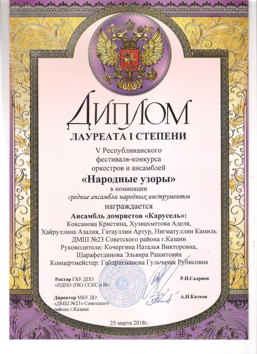 V Республиканский фестиваль-конкурс оркестров и ансамблей "Народные узоры" - Диплом лауреата 1 степени - Ансамбль домристов "Карусель" (руководители: Кочергина Н.В., Шарафетдинова Э.Р., концертмейстер: Габдрахманова Г.Р.)