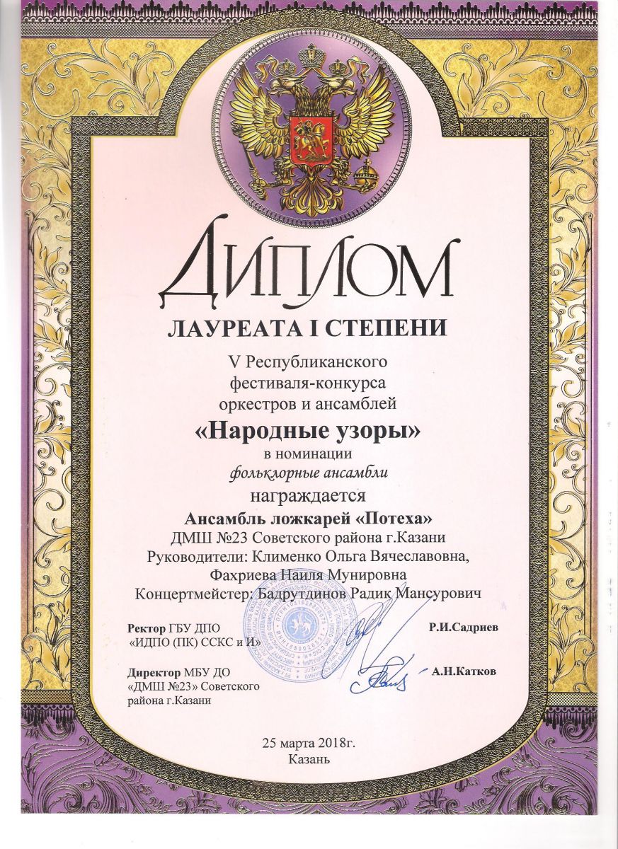 V Республиканский фестиваль-конкурс оркестров и ансамблей "Народные узоры" - Диплом лауреата 1 степени - Ансамбль ложкарей "Потеха" (руководители: Клименко О.В., Фахриева Н.М., концертмейстер: Бадрутдинов Р.М.)