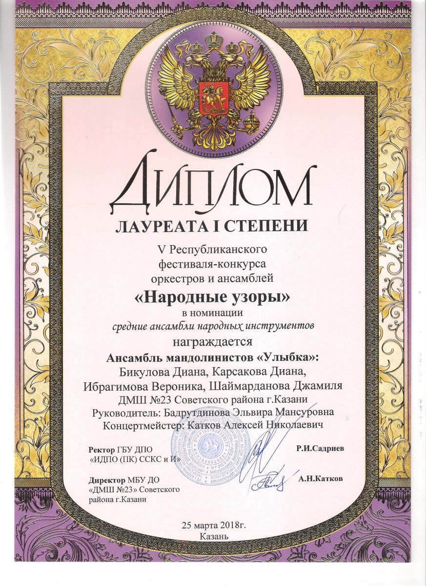 V Республиканский фестиваль-конкурс оркестров и ансамблей "Народные узоры" - Диплом лауреата 1 степени - Ансамбль мандолинистов "Улыбка" (руководитель: Бадрутдинова Э.М., концертмейстер: Катков А.Н.)