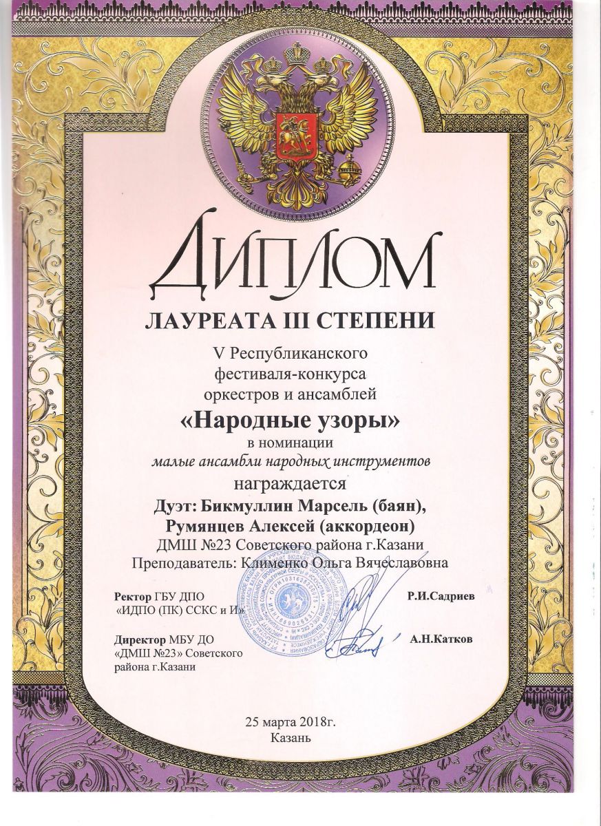 V Республиканский фестиваль-конкурс оркестров и ансамблей "Народные узоры" - Диплом лауреата 3 степени - Дуэт: Бикмуллин Марсель, Румянцев Алексей (преподаватель: Клименко О.В.)