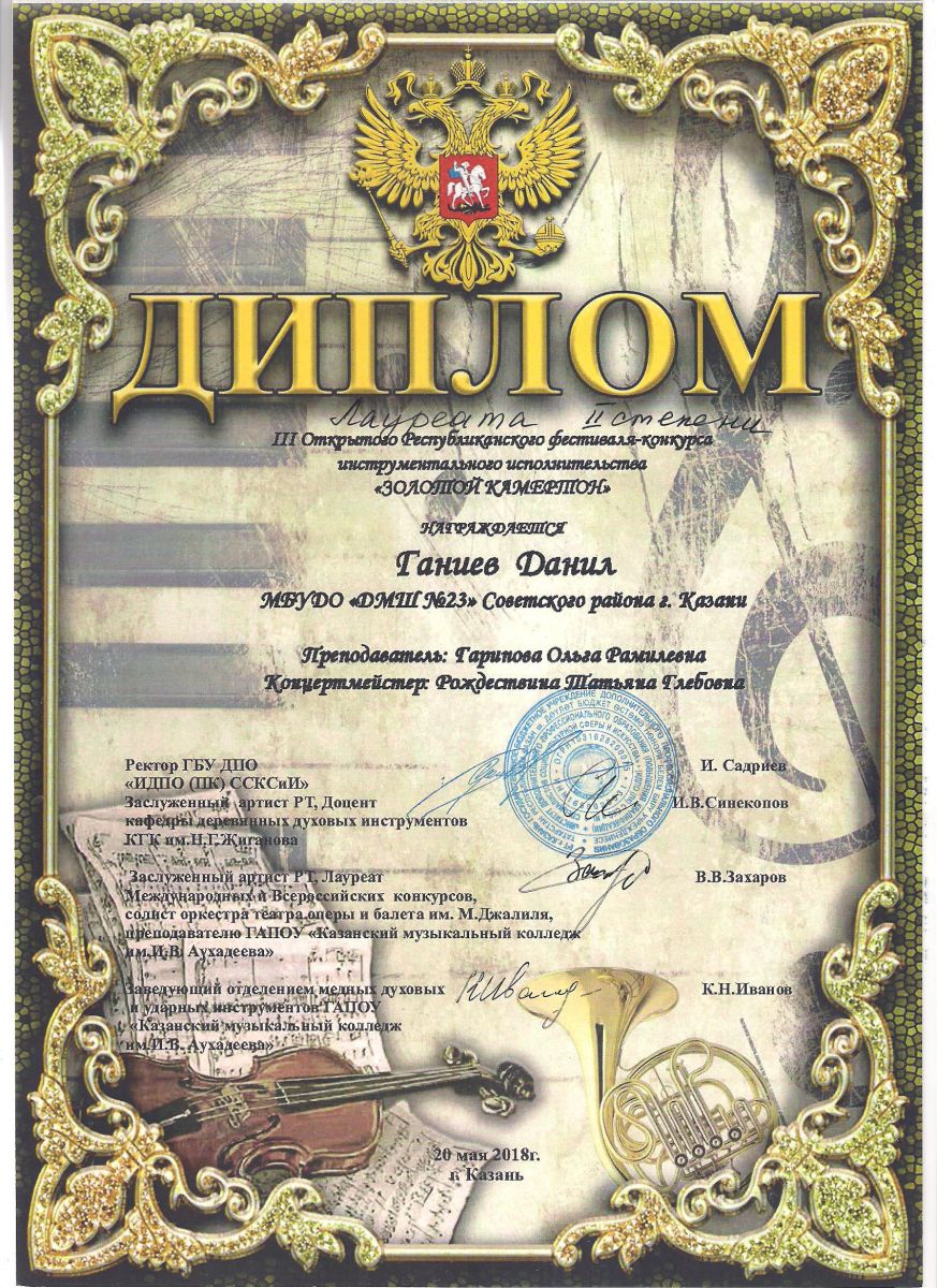III Открытый Республиканский фестиваль-конкурс инструментального исполнительства "Золотой камертон" - Диплом лауреата 2 степени - Ганиев Данил (преподаватель: Гарипова О.Р., концертмейстер: Рождествина Т.Г.)