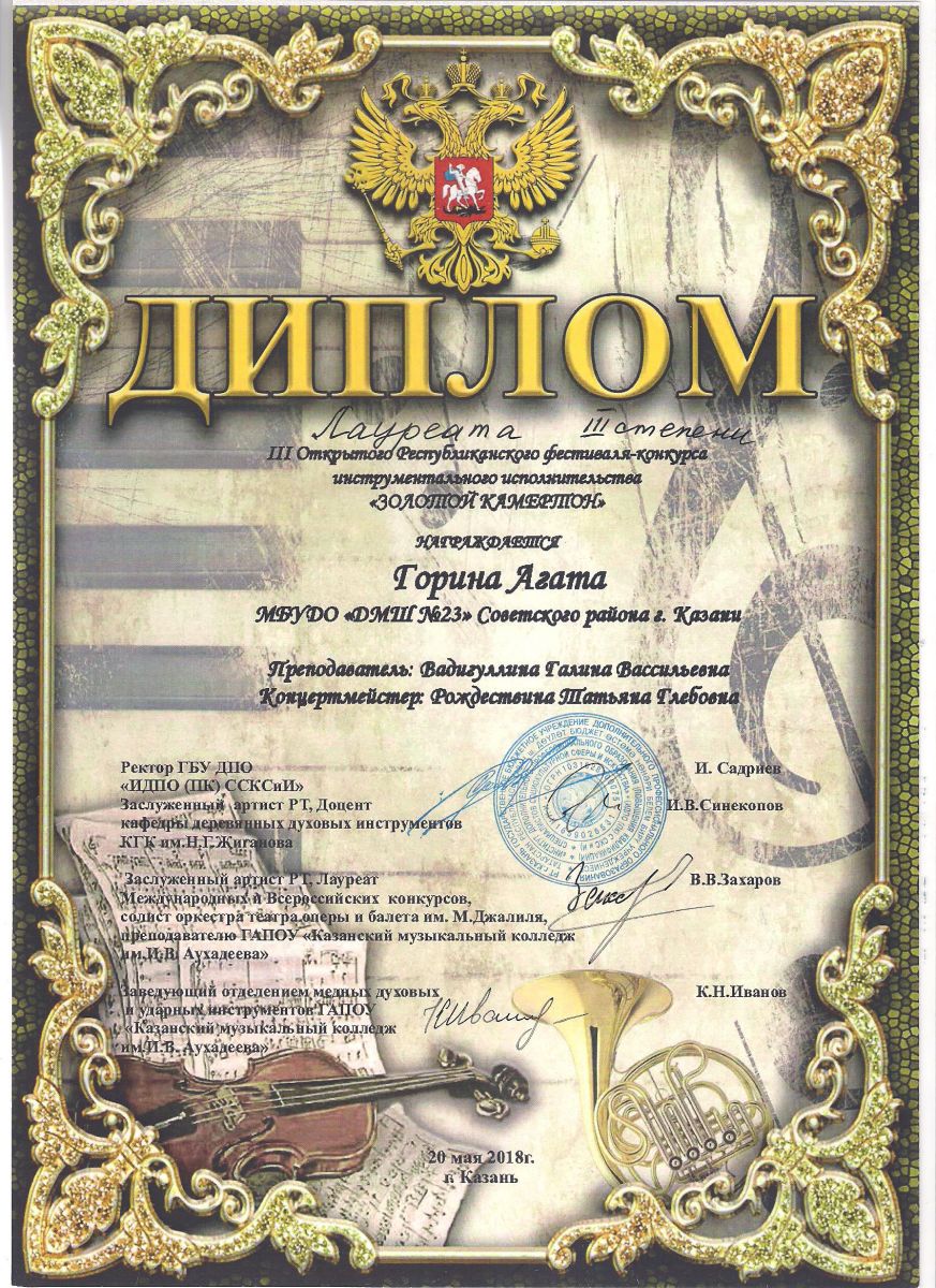 III Открытый Республиканский фестиваль-конкурс инструментального исполнительства "Золотой камертон" - Диплом лауреата 3 степени - Горина Агата (преподаватель: Вадигуллина Г.В., концертмейстер: Рождествина Т.Г.)