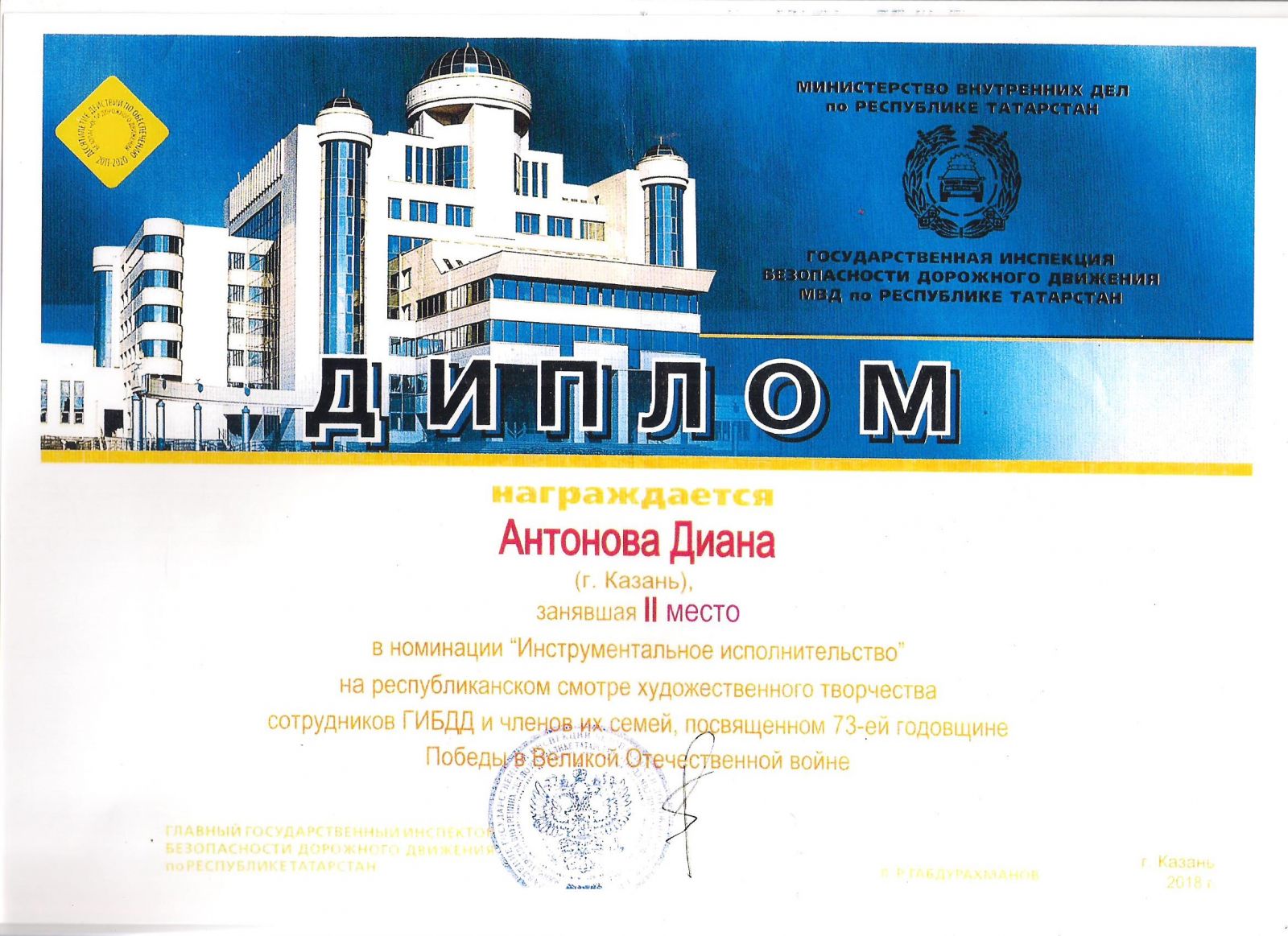 Республиканский смотр художественного творчества сотрудников ГИБДД и членов их семей - Диплом за 2 место - Антонова Диана (преподаватель: Матвеева Н.П.)