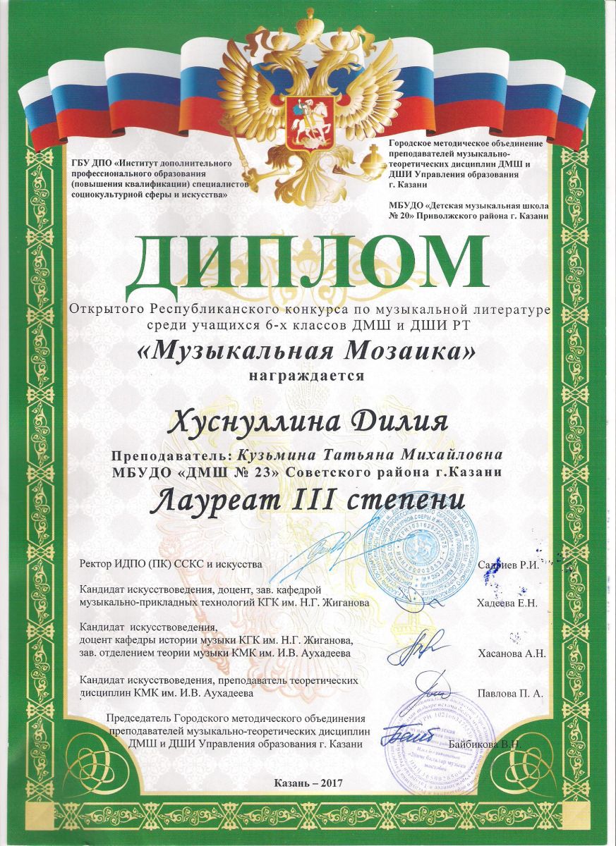 Открытый Республиканский конкурс по музыкальной литературе среди учащихся 6-х классов ДМШ и ДШИ РТ "Музыкальная мозаика" - Диплом лауреата 3 степени - Хуснуллина Д. (преподаватель: Кузьмина Т.М.)