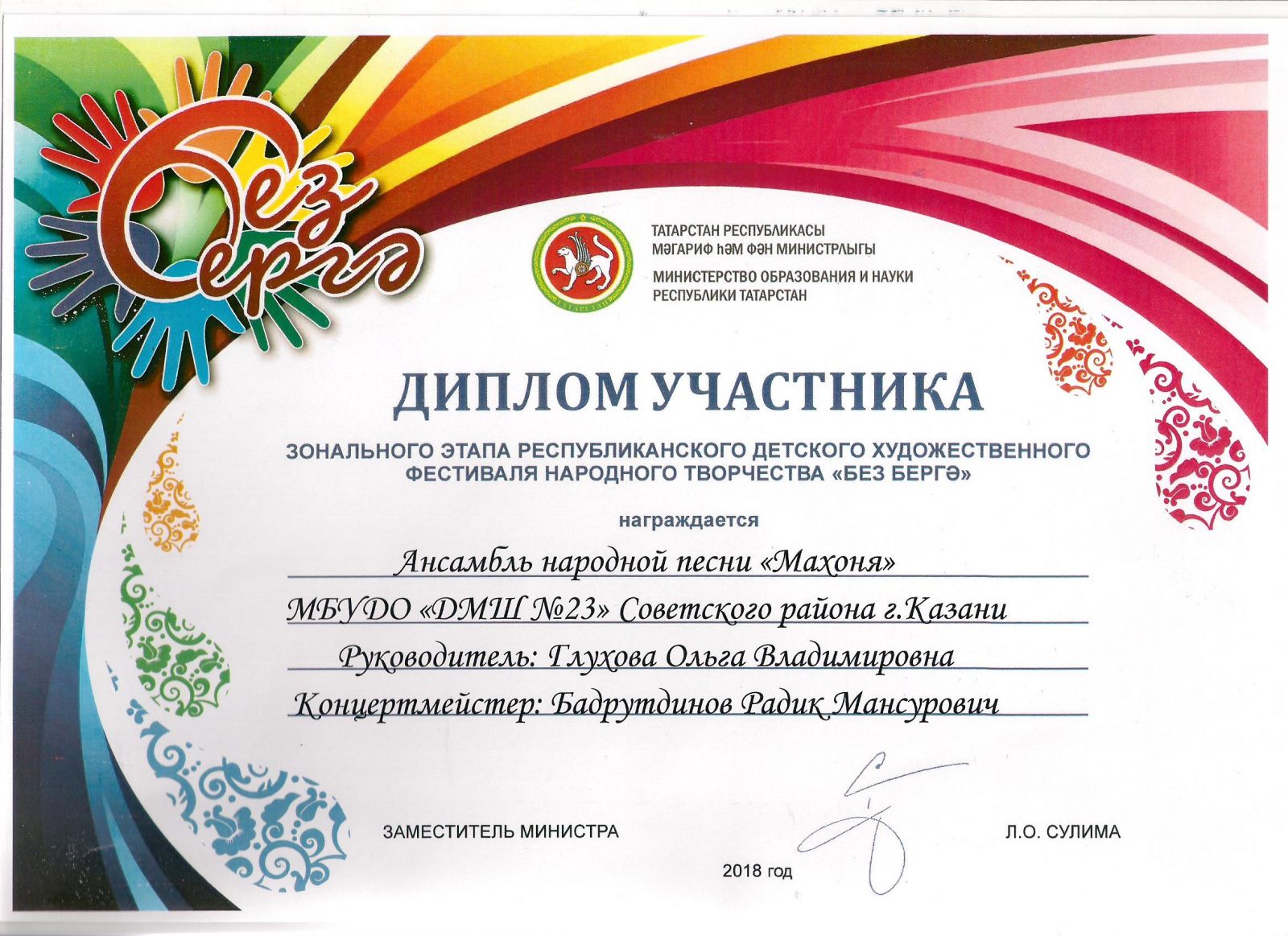 Зональный этап Республиканского детского художественного фестиваля народного творчества "Без бергэ" - Диплом участника - Ансамбль народной песни "Махоня" (руководитель: Глухова О.В., концертмейстер: Бадрутдинов Р.М.)