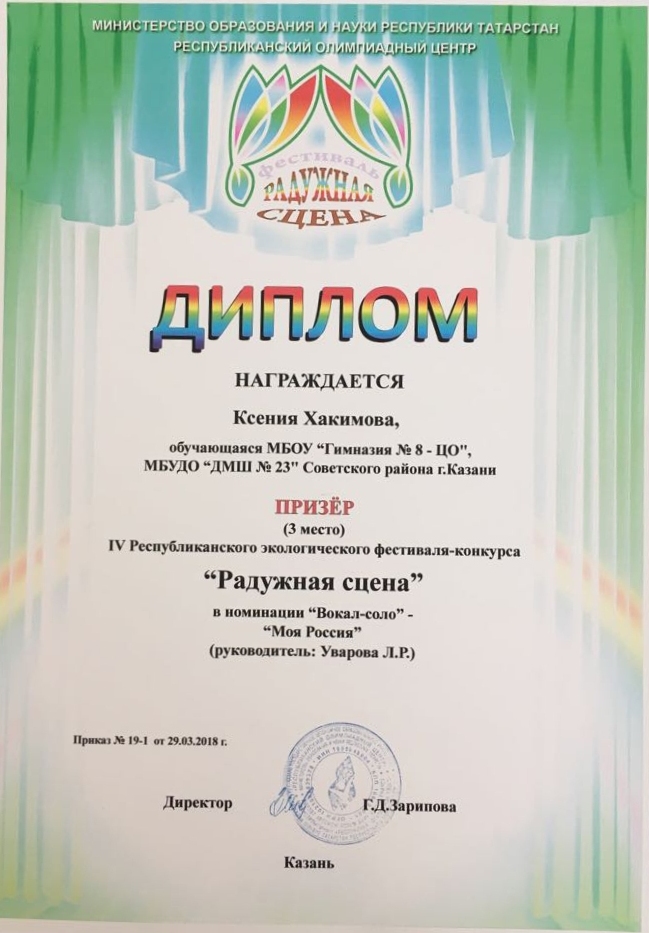 IV Республиканский экологический фестиваль-конкурс "Радужная сцена" - Диплом призёра (3 место) - Хакимова Ксения (преподаватель: Уварова Л.Р.)