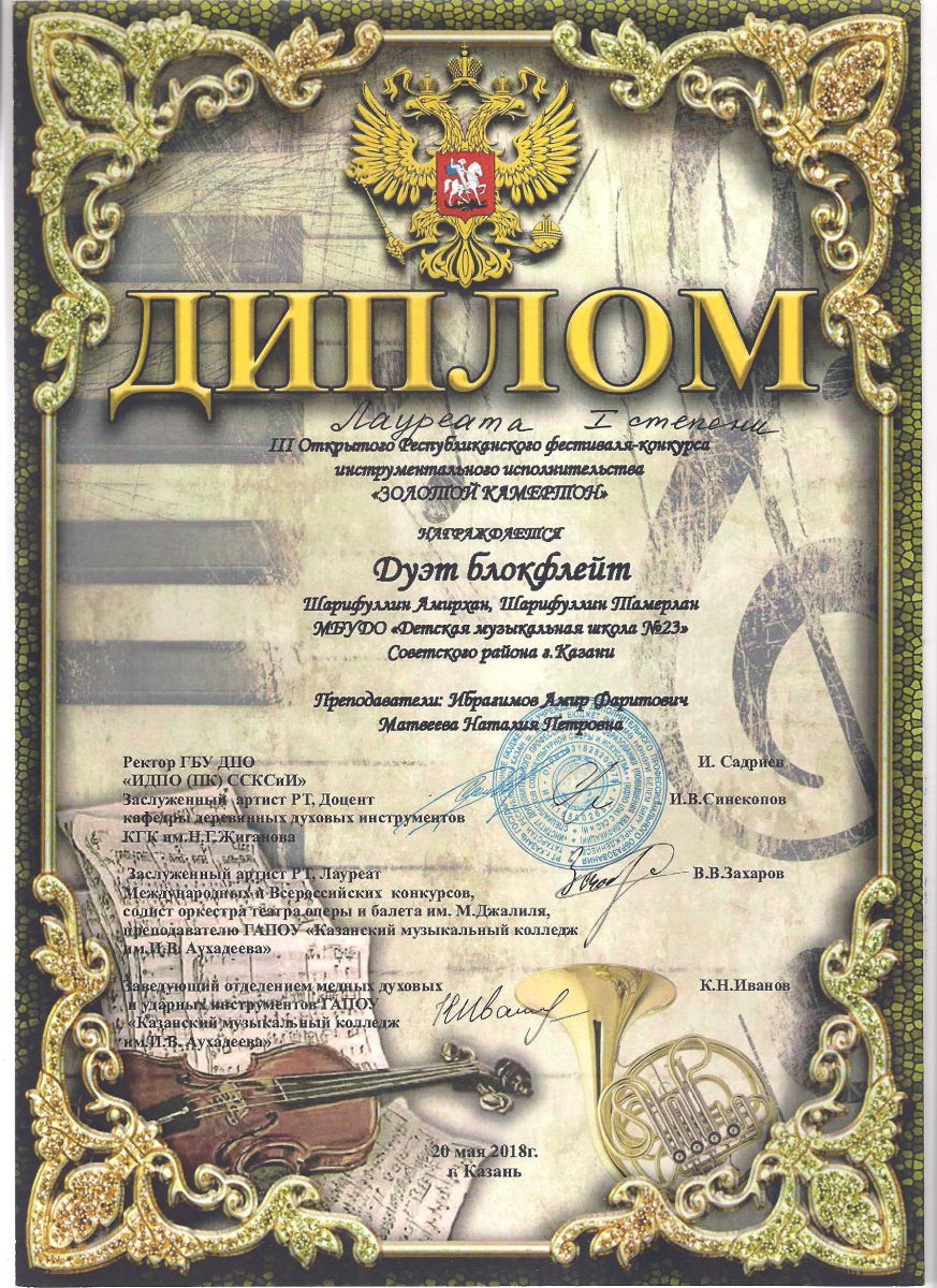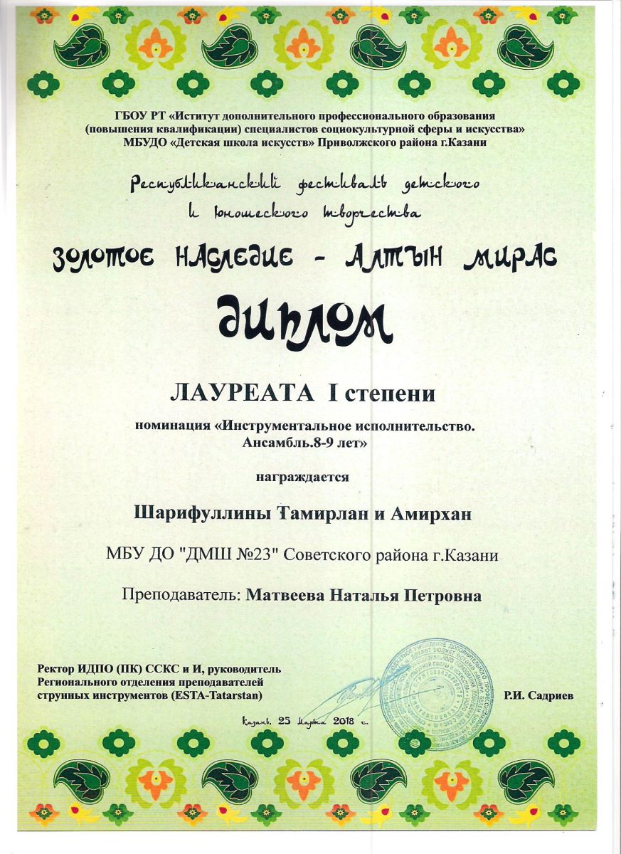 III Открытый Республиканский фестиваль-конкурс инструментального исполнительства "Золотой камертон" - Диплом лауреата 1 степени - Дуэт: Шарифулин Тамерлан, Шарифулин Амирхан (преподаватели: Матвеева Н.П., Ибрагимов А.Ф.)