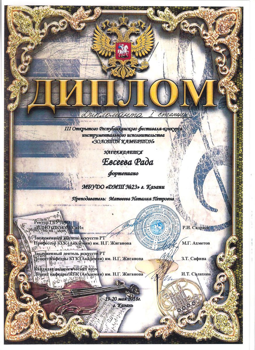 III Открытый Республиканский фестиваль-конкурс инструментального исполнительства "Золотой камертон" - Диплом дипломанта 1 степени - Евсеева Рада (преподаватель: Матвеева Н.П.)